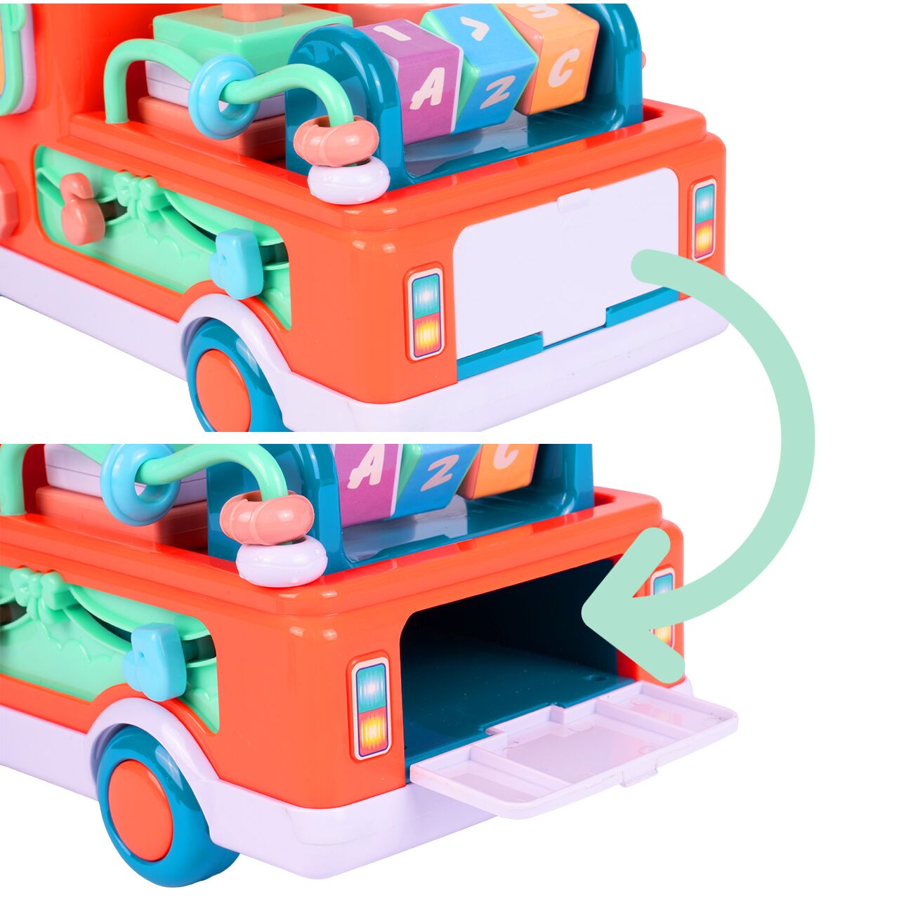 Warto zwrócić uwagę również na tylną otwieraną klapkę. To detal, który z perspektywy rodzica robi sporą różnicę — bo dziecko dostaje kolejną funkcję do odkrywania, a Ty mniej szukania drobnych elementów po całym pokoju. Właśnie takie rozwiązania sprawiają, że ta zabawka jest przemyślana i po prostu wygodna w codziennym użyciu.