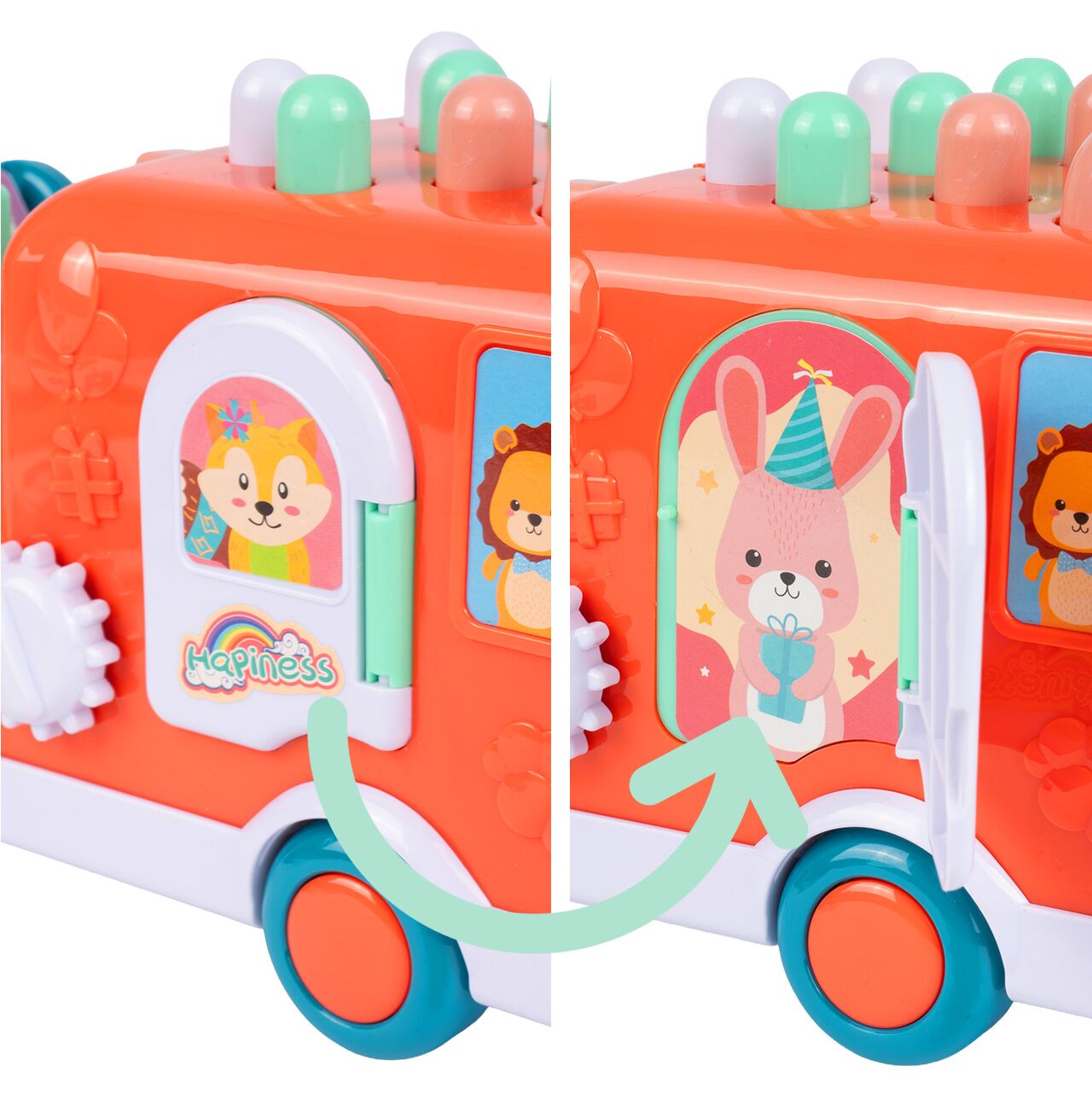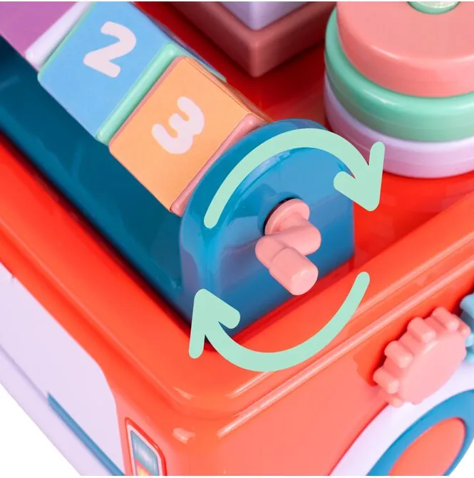 Ten model nie kończy się na stukaniu. Na dziecko czekają także otwierane drzwiczki i okienka z obrazkami, ruchome elementy po bokach oraz obrotowy wałek z kolorowymi kostkami. Dla malucha to świetna zabawa, bo coś dzieje się po każdym dotknięciu — coś można otworzyć, obrócić, przesunąć albo sprawdzić, co kryje się w środku.