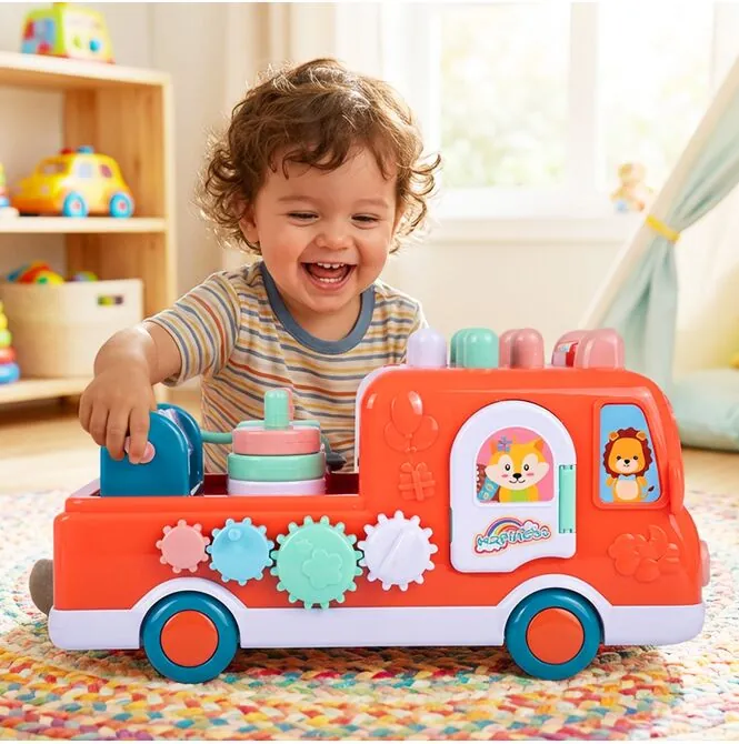 Autobus edukacyjny zbijak został zaprojektowany tak, żeby dziecko nie miało wrażenia, że dostało jedną funkcję i koniec. Tu naprawdę dużo się dzieje — można stukać młoteczkiem, obracać elementy, otwierać okienka, przesuwać części, bawić się dodatkami i odkrywać kolejne aktywności. Dzięki temu zabawka dłużej utrzymuje uwagę malucha i nie trafia po chwili na dno kosza z zabawkami.