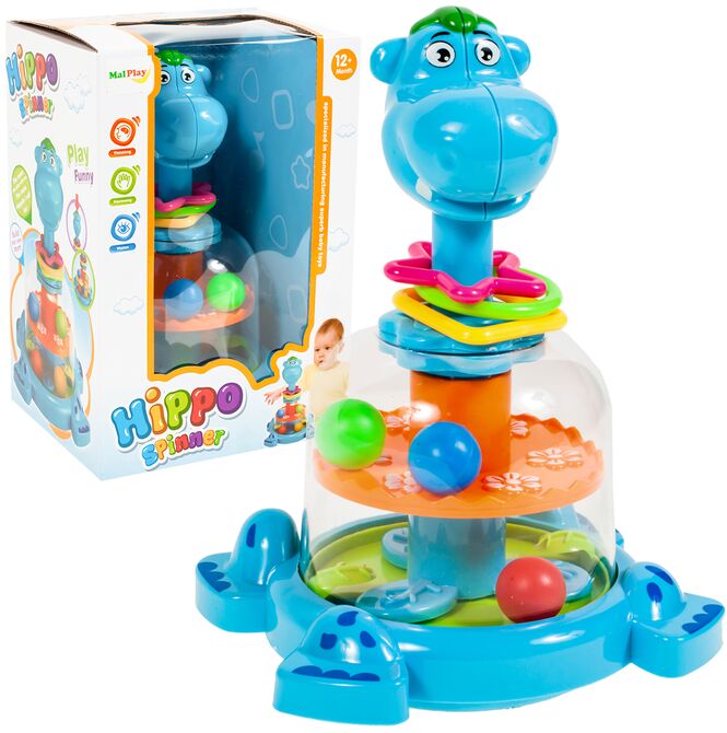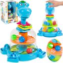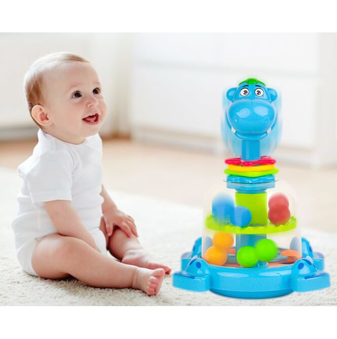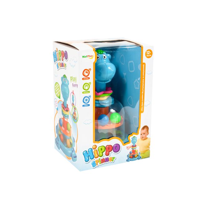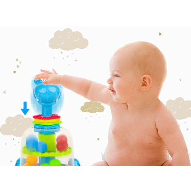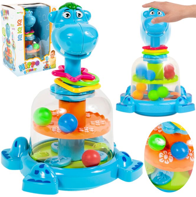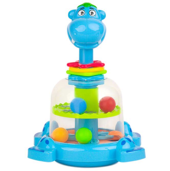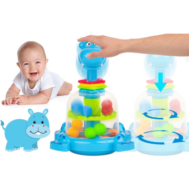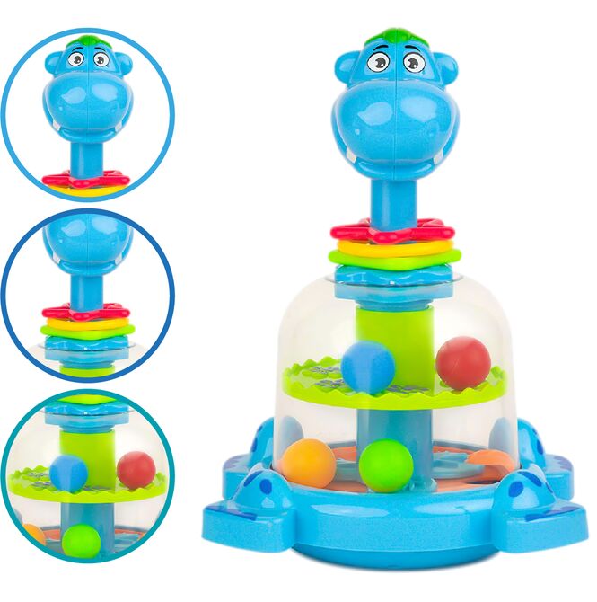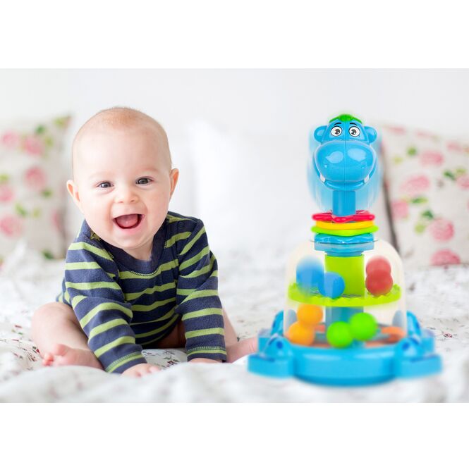 Klasyczna zabawka dla najmłodszych z kolorowym Hipciem! Naciśnij na głowę hipcia i zobacz, jak piłeczki podskakują i trafiają w odpowiednie miejsca w brzuszku!