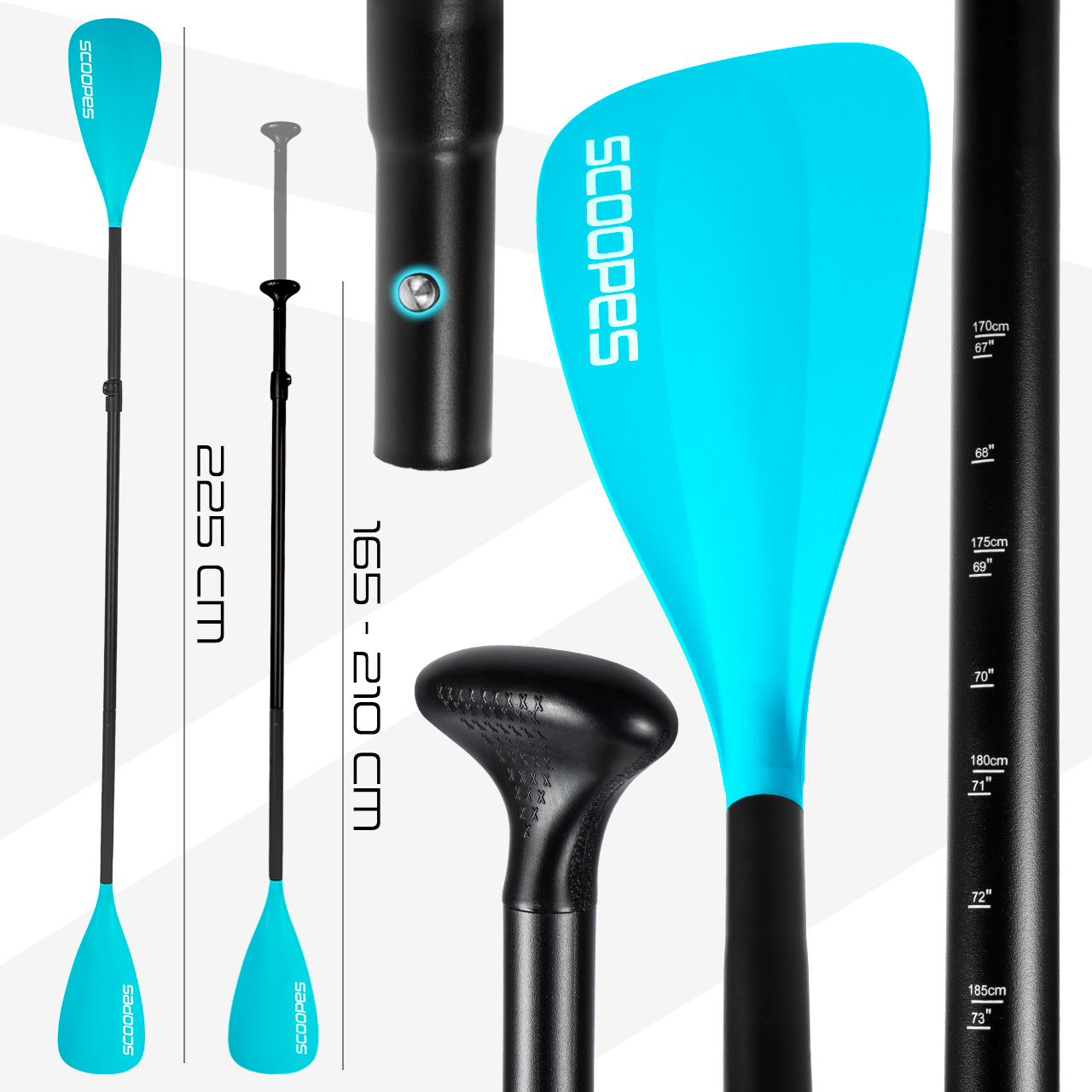 Aluminiowe regulowane wiosło 2w1: wersja SUP 165–210 cm, wersja kajakowa 225 cm.