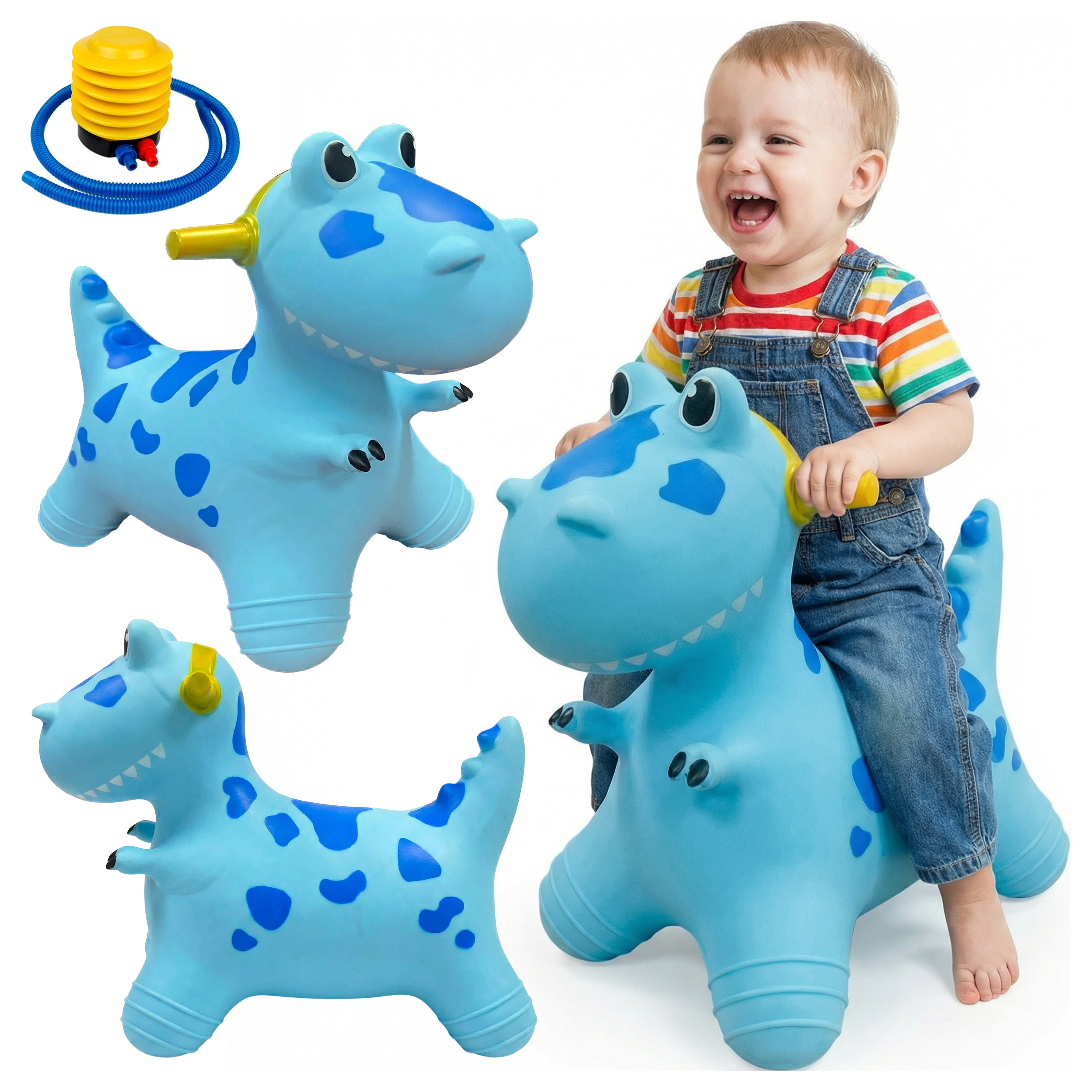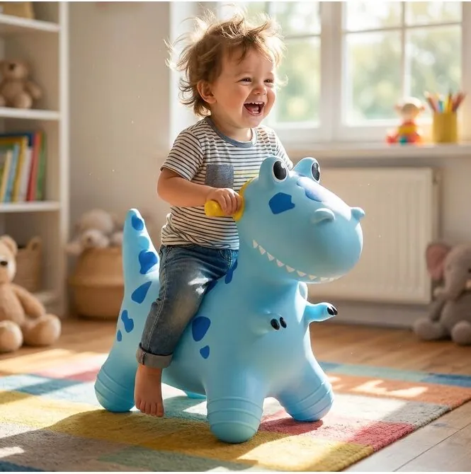 Dziecko nie dostaje anonimowego skoczka, tylko własnego dinozaura z wygodnym miejscem do siedzenia, na którym może urządzać wyścigi, wyprawy i codzienne przejażdżki po pokoju. To właśnie ten wygląd najmocniej pobudza wyobraźnię i sprawia, że maluch dużo bardziej przywiązuje się do zabawki. Dinozaur wygląda przyjaźnie, efektownie i od pierwszego spojrzenia zachęca, żeby na niego wsiąść.