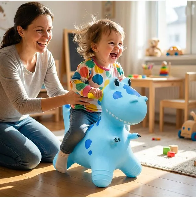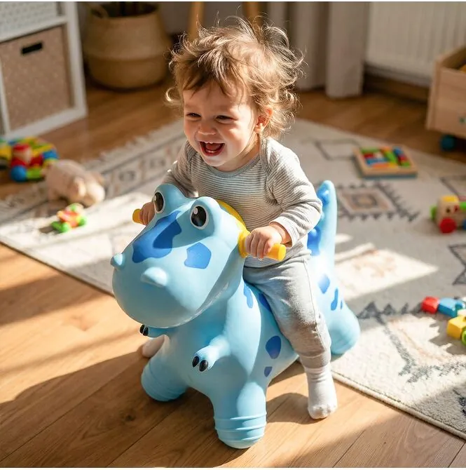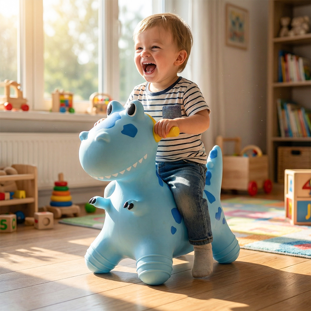Dinozaur został zaprojektowany tak, aby dziecko mogło wygodnie usiąść i stabilnie trzymać się podczas zabawy. Boczne uchwyty pomagają pewnie złapać skoczka podczas skakania i odbijania, dzięki czemu maluch ma lepszą kontrolę nad ruchem.  Odpowiedni kształt całej zabawki sprawia, że dziecko szybko łapie pewność siebie i chętnie wraca do kolejnych przejażdżek.