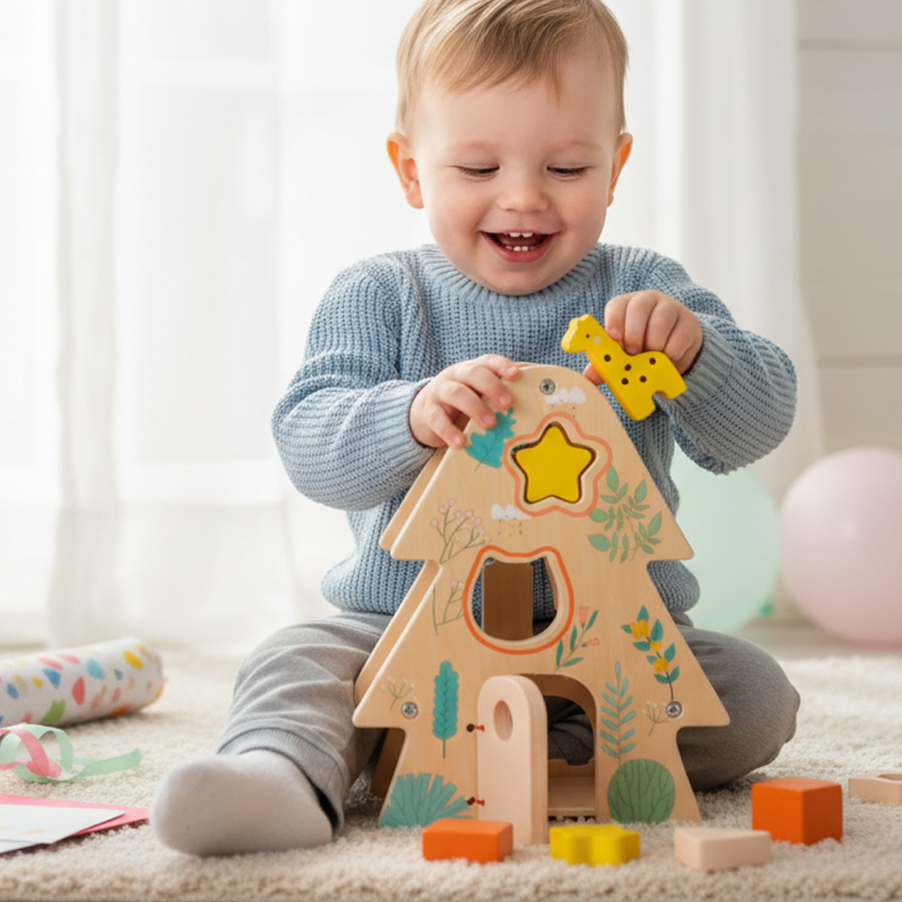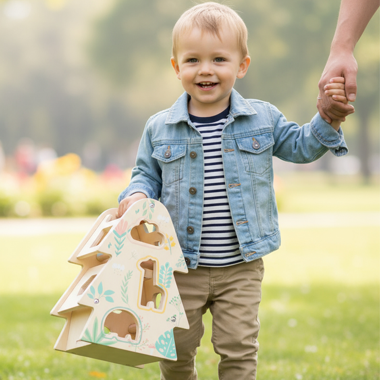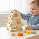 • Leśne drzewko–domek pełen zadań – dziecko dopasowuje klocki do otworów, chowa zwierzątka w środku i odkrywa kolejne niespodzianki.