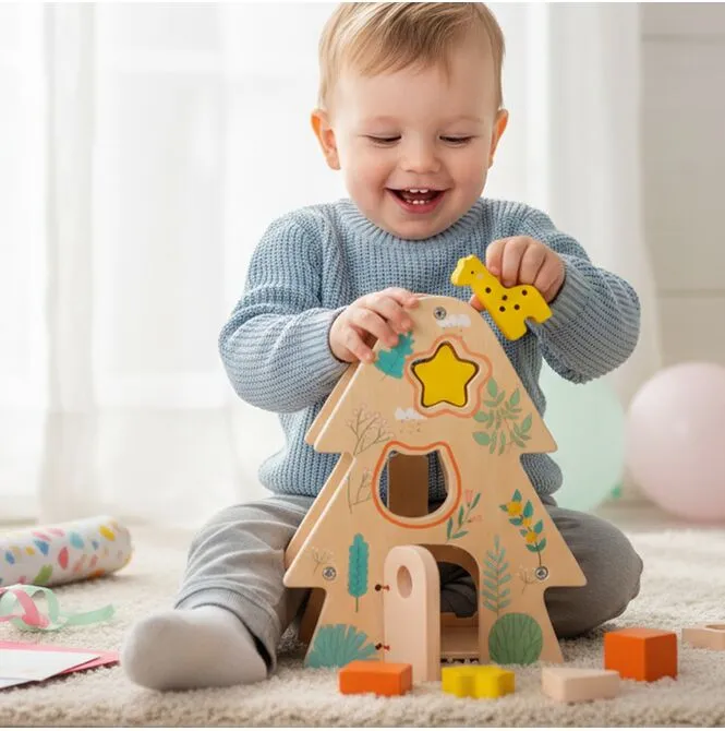 DREWNIANA UKŁADANKA EDUKACYJNA SORTER KSZTAŁTÓW DOMEK DRZEWKO CHOINKA