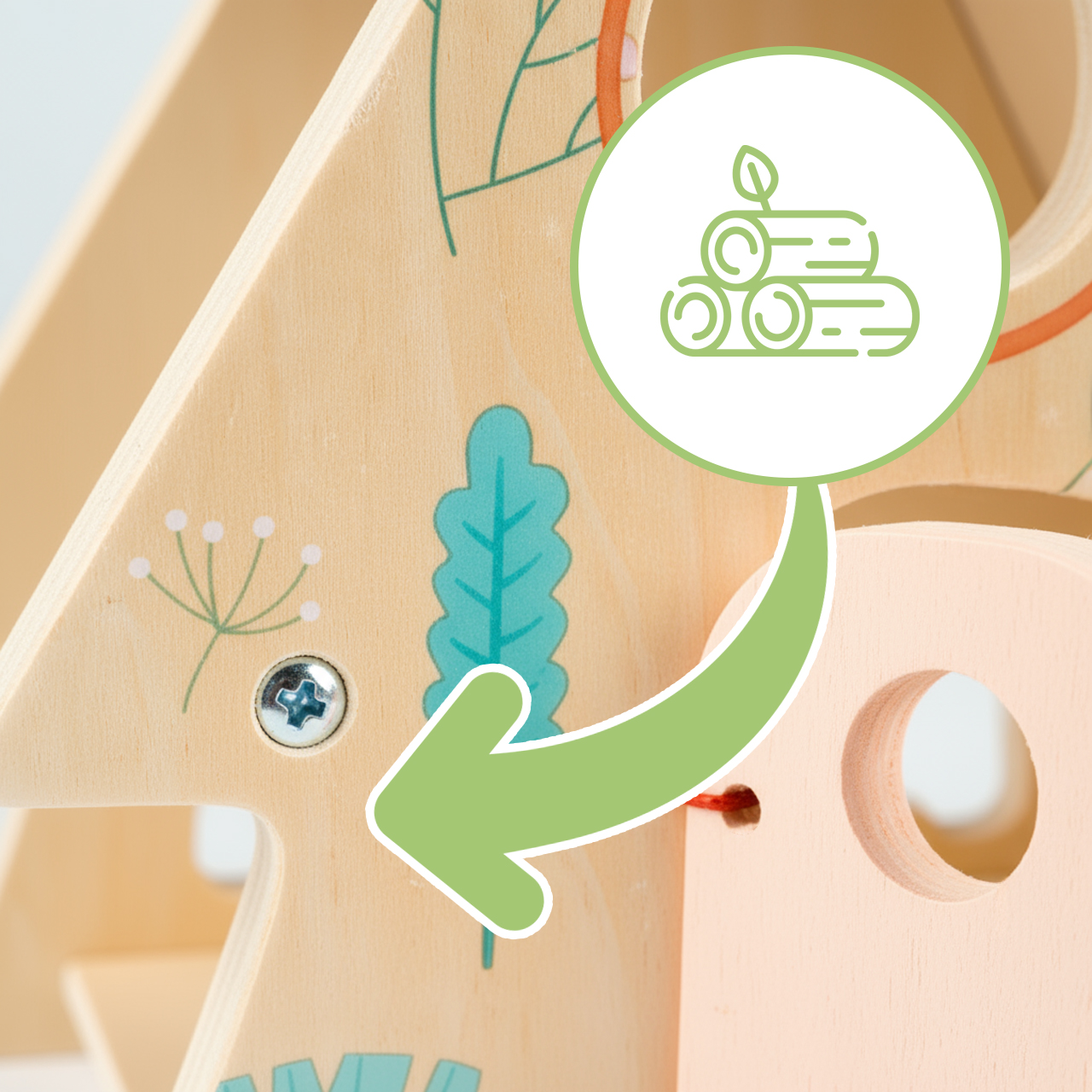• Bezpieczne, naturalne materiały – gładko szlifowane drewno, zaokrąglone krawędzie, nietoksyczne farby w pastelowych kolorach.