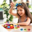 Na skrzydełkach znajduje się 10 kolorowych pól. Dziecko sortuje biedronki według barw, uczy się nazw kolorów i ćwiczy liczenie: „ile czerwonych?”, „ile razem?”. To naturalny wstęp do matematyki i klasyfikowania przedmiotów.