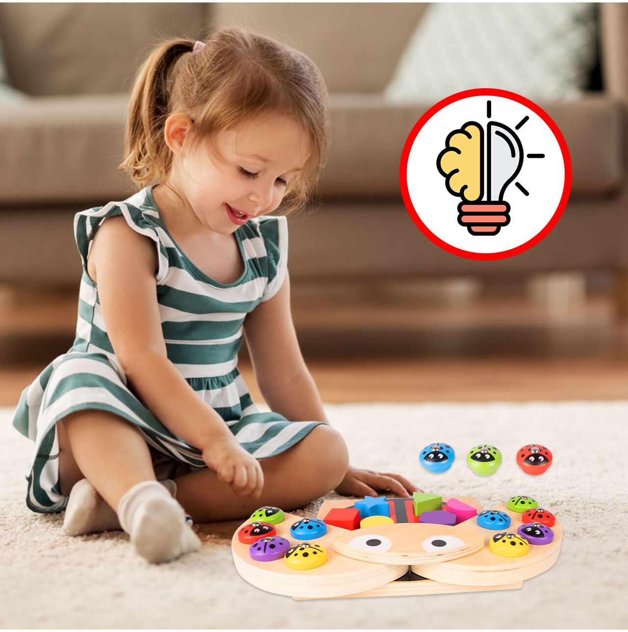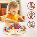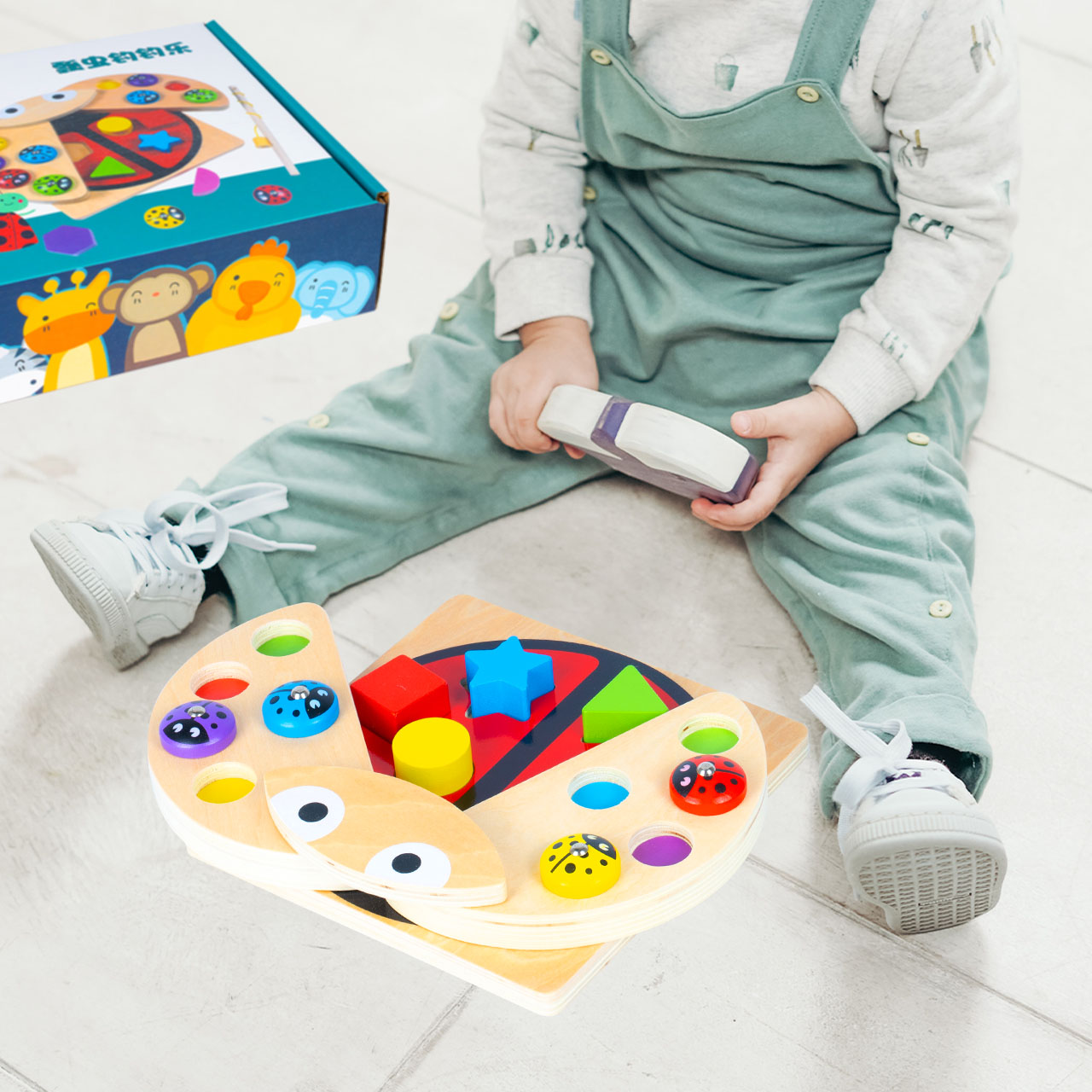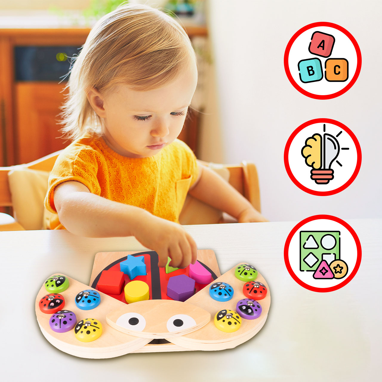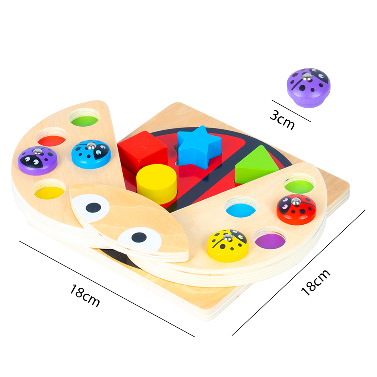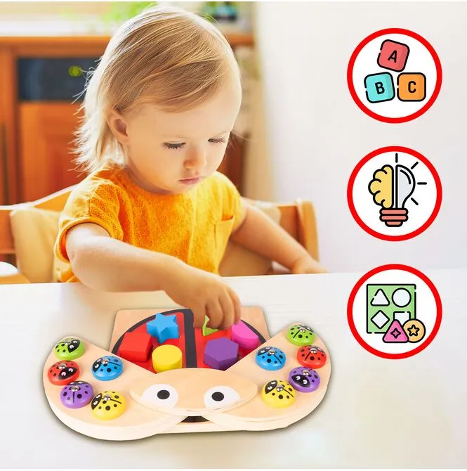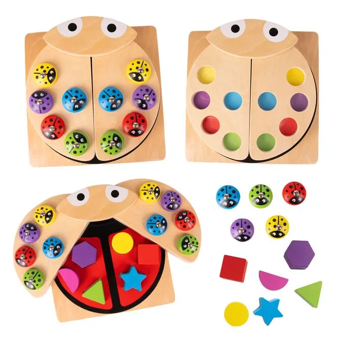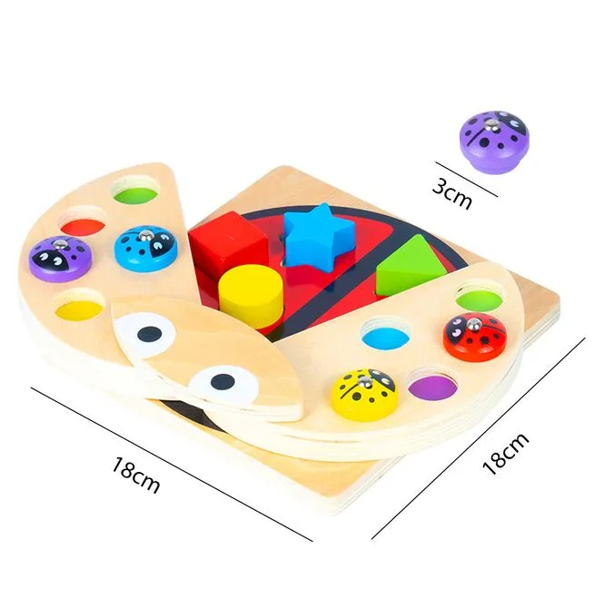 Po uchyleniu skrzydełek biedronki dziecko odkrywa planszę z 6 gniazdami na figury. Dopasowywanie klocków do odpowiednich otworów rozwija spostrzegawczość, rozpoznawanie kształtów i orientację przestrzenną. Każdy sukces to mały krok w stronę samodzielności.