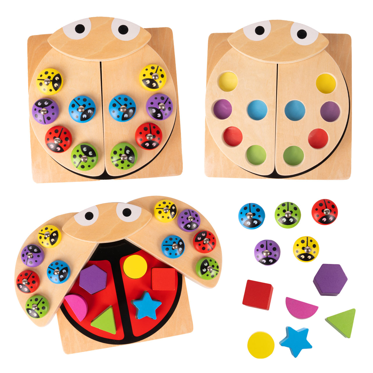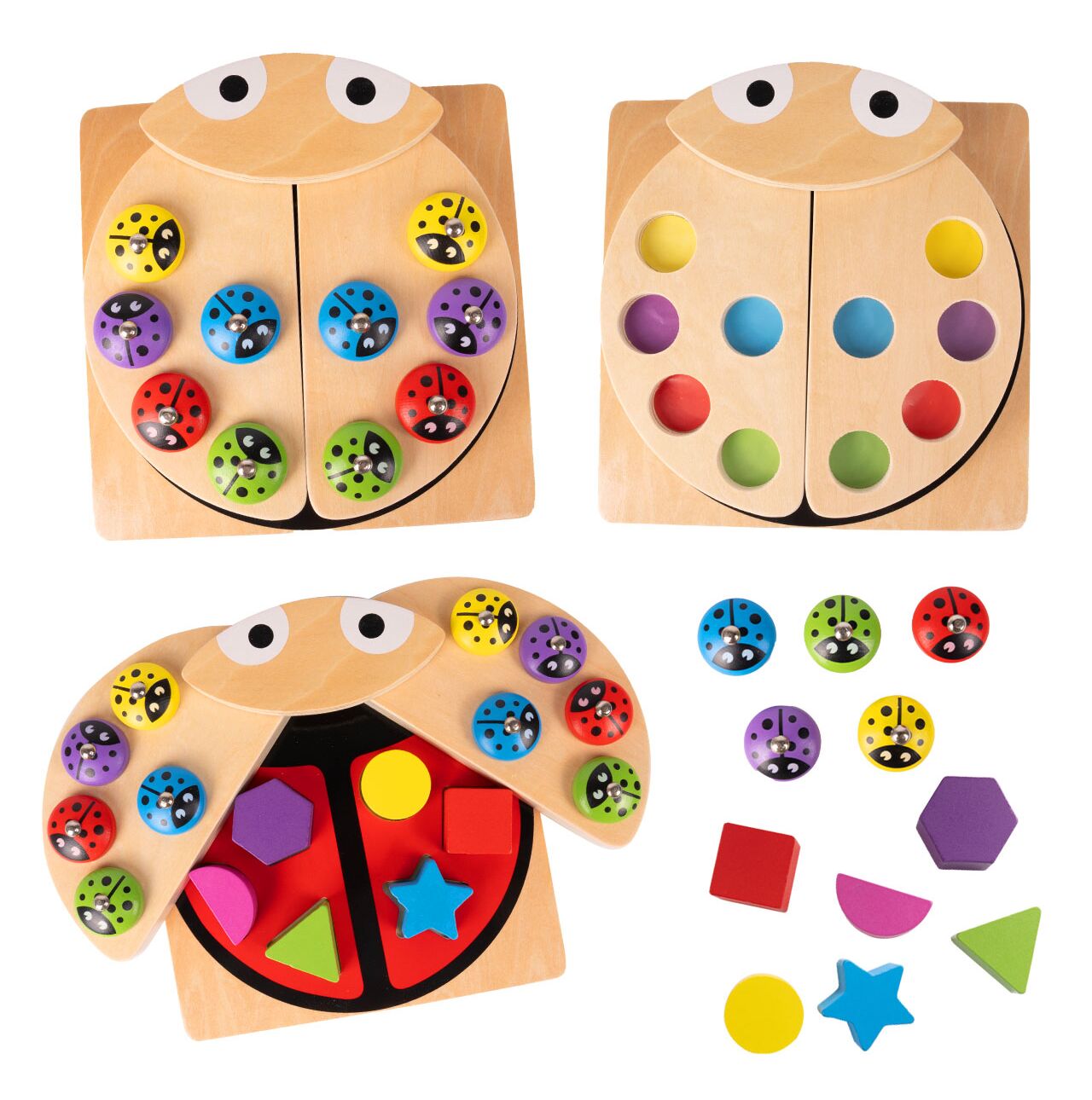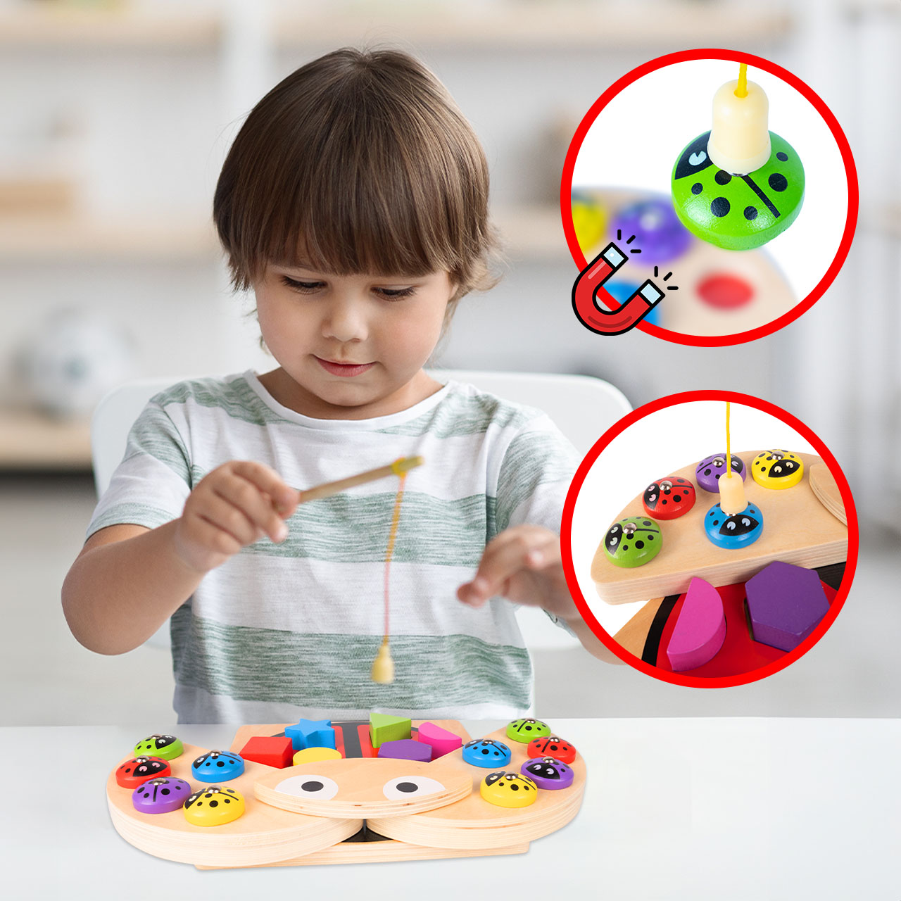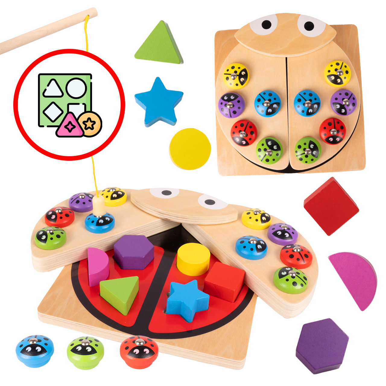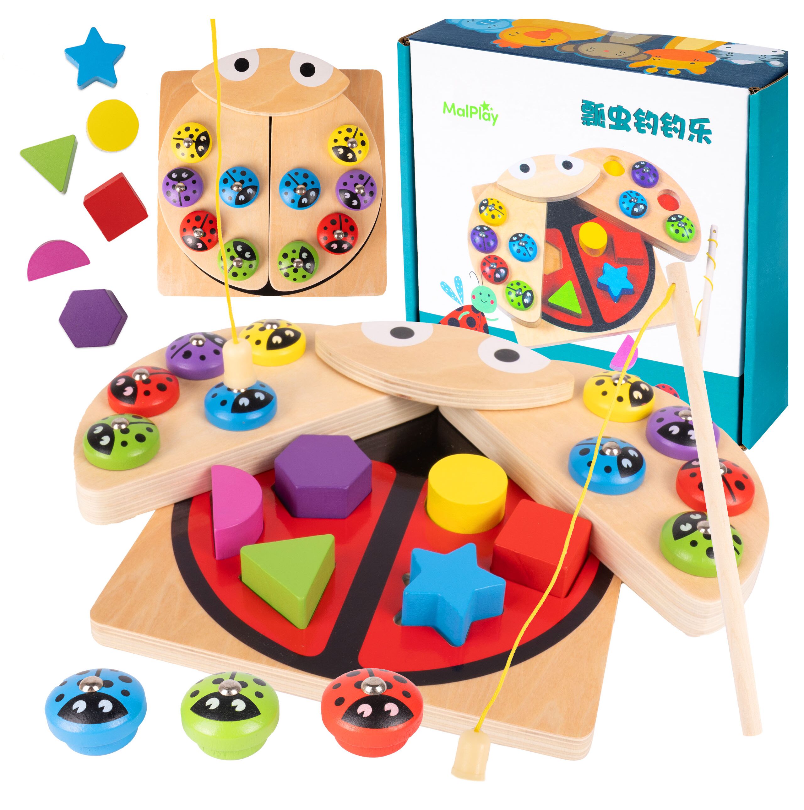 • 3w1 – łowienie magnetycznych „biedronek”, sorter kształtów i układanka kolorów w jednej zabawce.