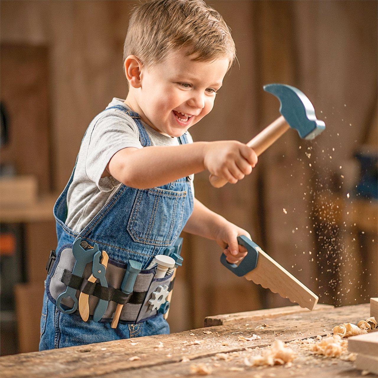 Dzieci uwielbiają naśladować dorosłych. Kiedy tata czy dziadek sięga po młotek – maluch chce robić to samo. Ten zestaw pozwala mu uczestniczyć w pracach domowych bez ryzyka i stresu.