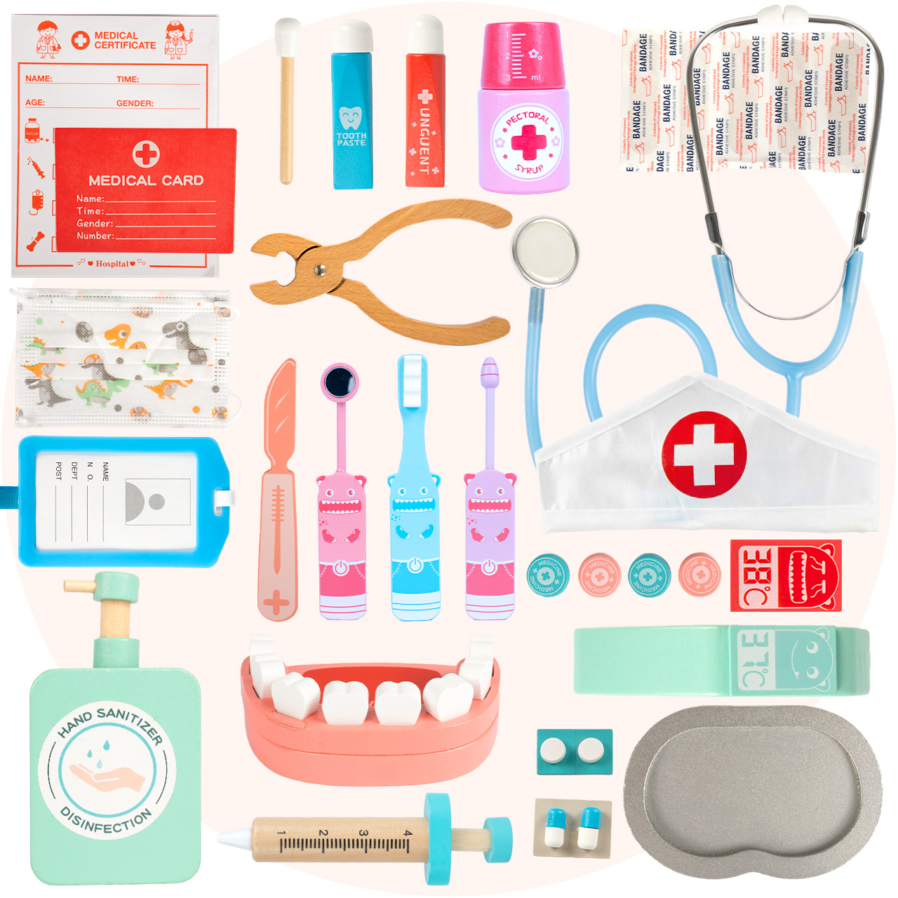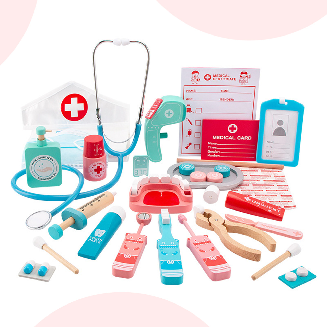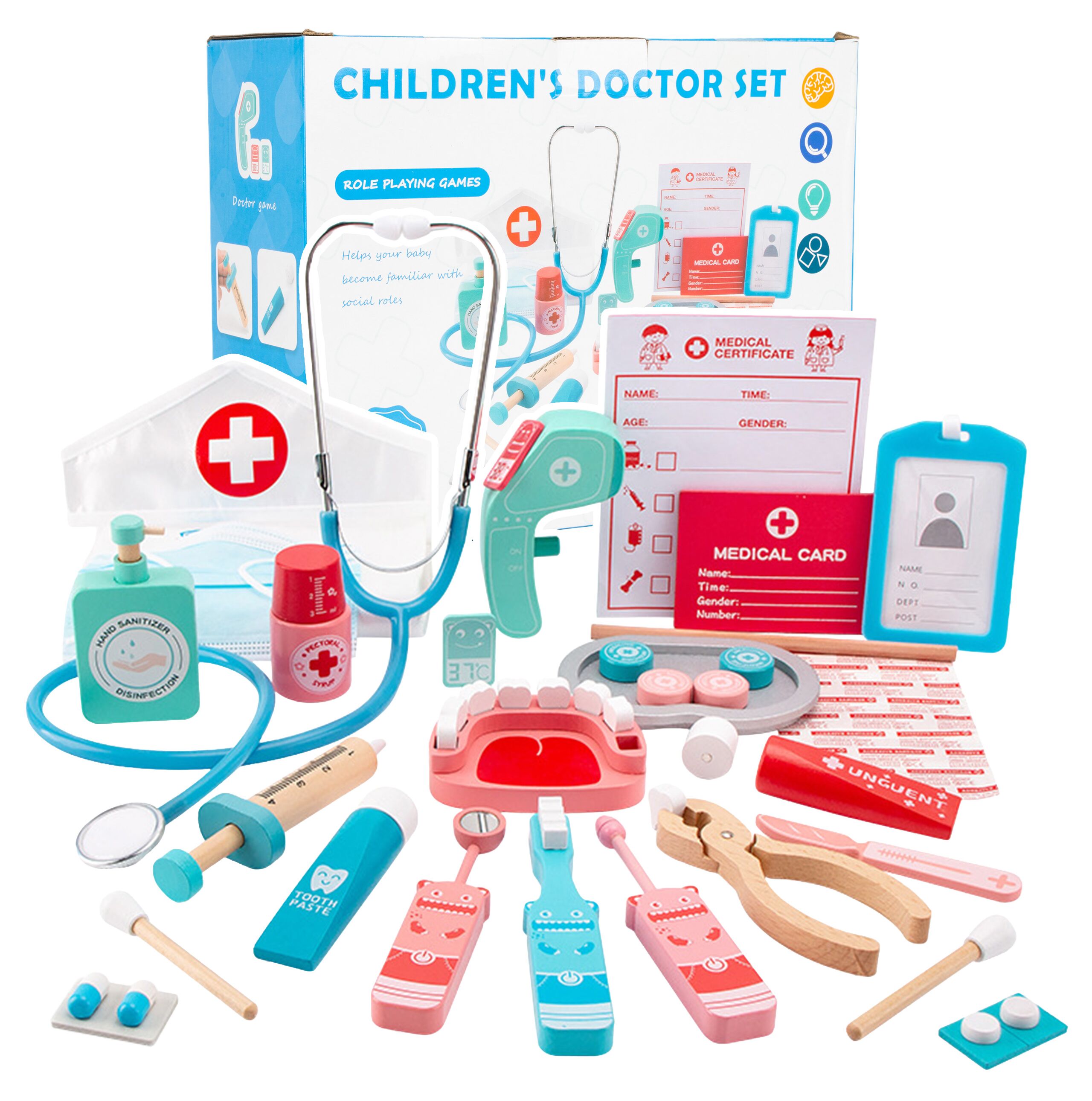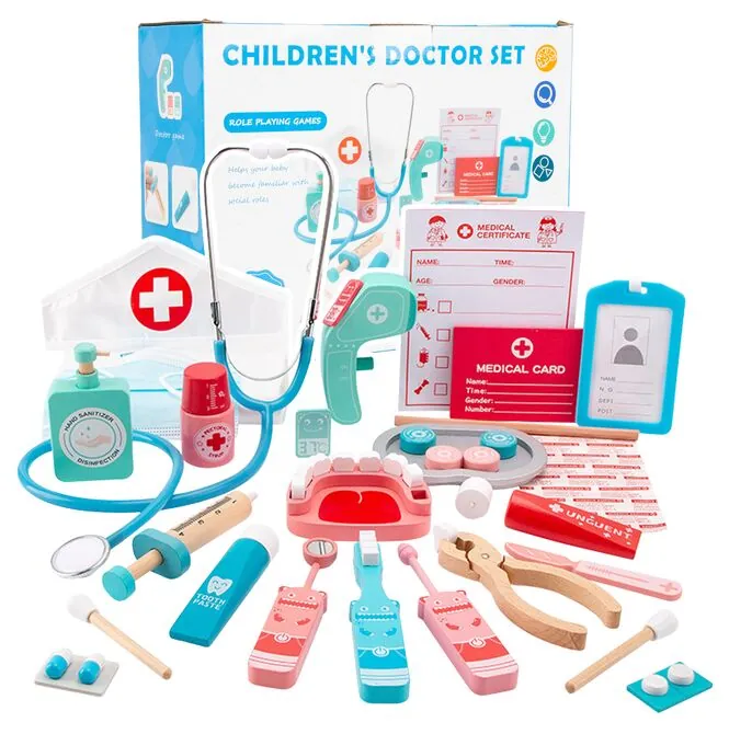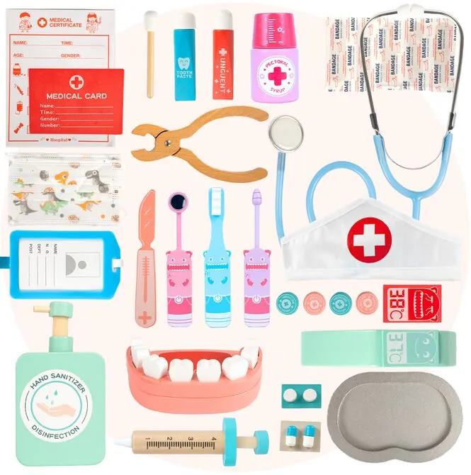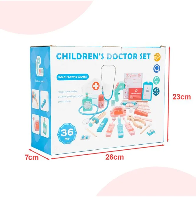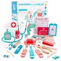 DREWNIANY ZESTAW LEKARSKI MAŁY DOKTOR Z CZEPKIEM STETOSKOP TERMOMETR 30 EL.