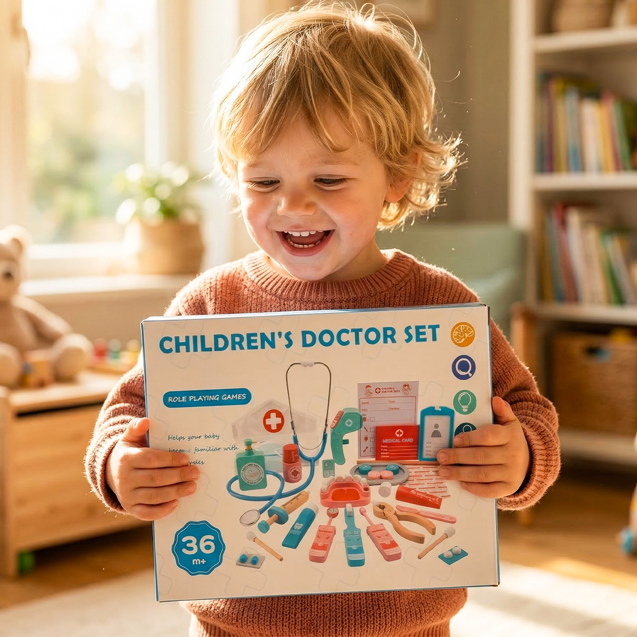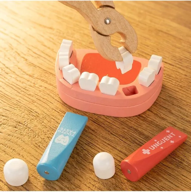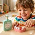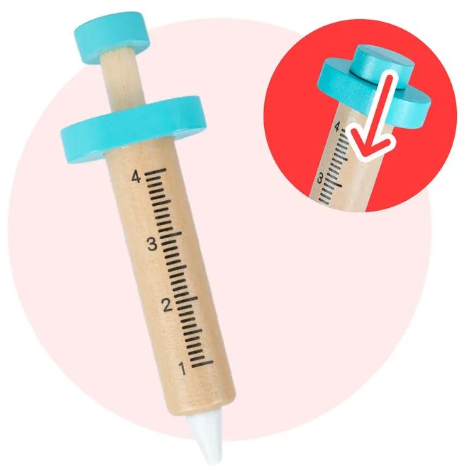 Ten drewniany zestaw medyczny pozwala oswoić temat w bezpiecznym środowisku domowym. Dziecko bada misia, sprawdza temperaturę, słucha serca stetoskopem i wypisuje kartę pacjenta.