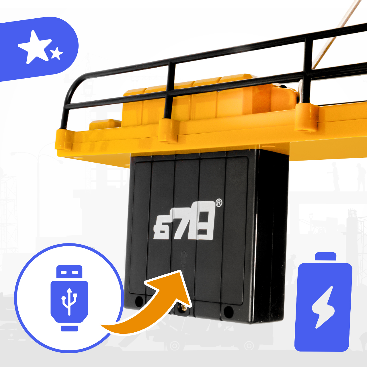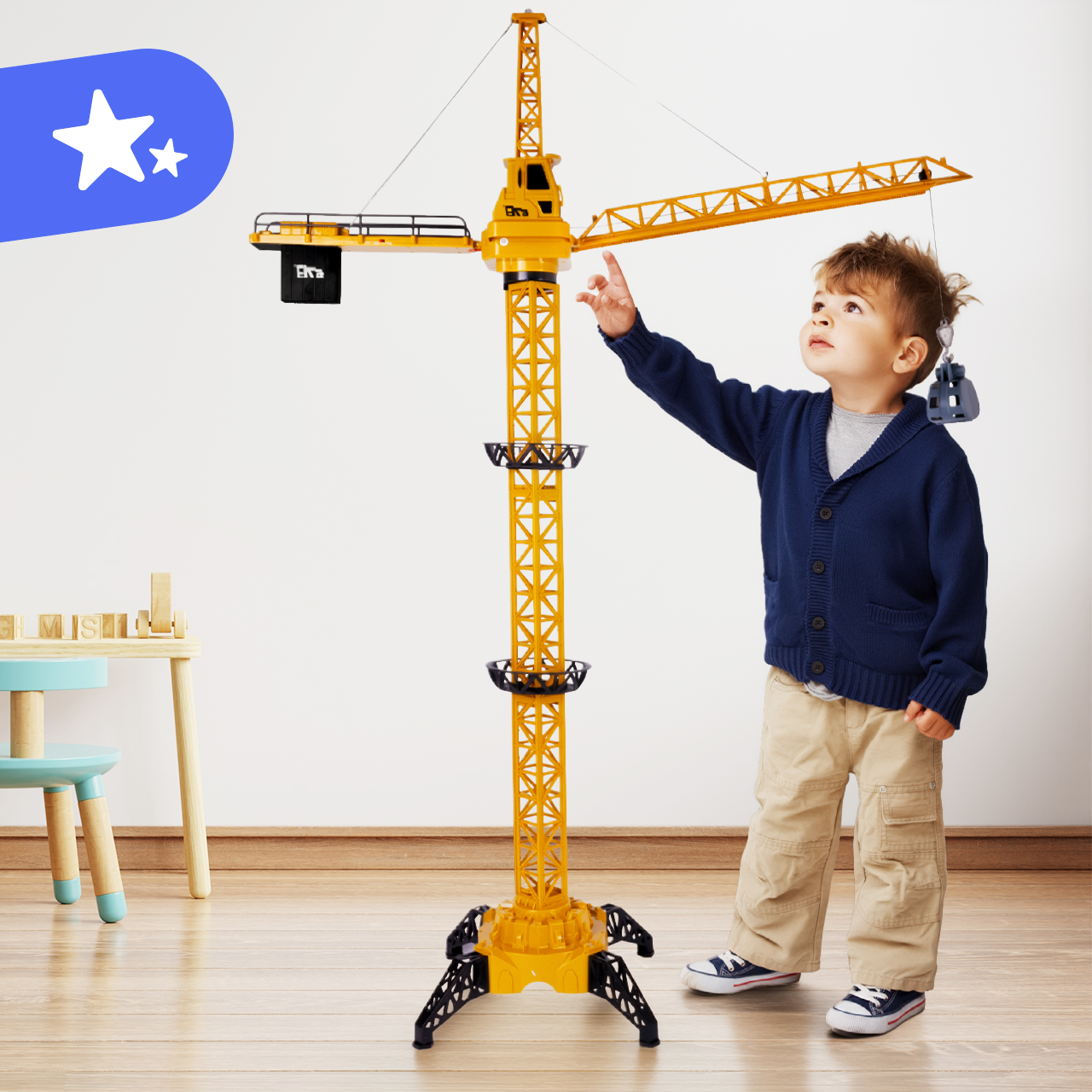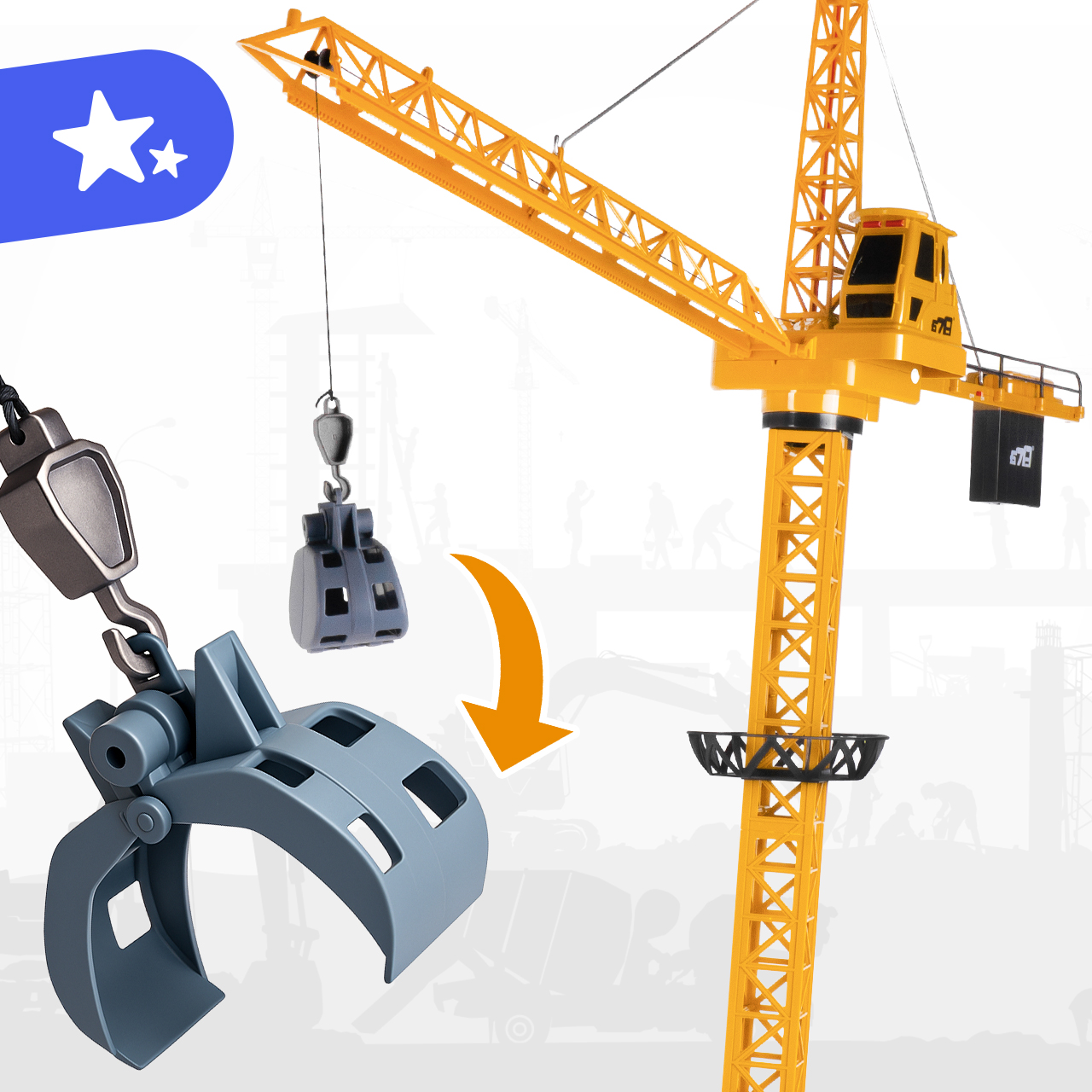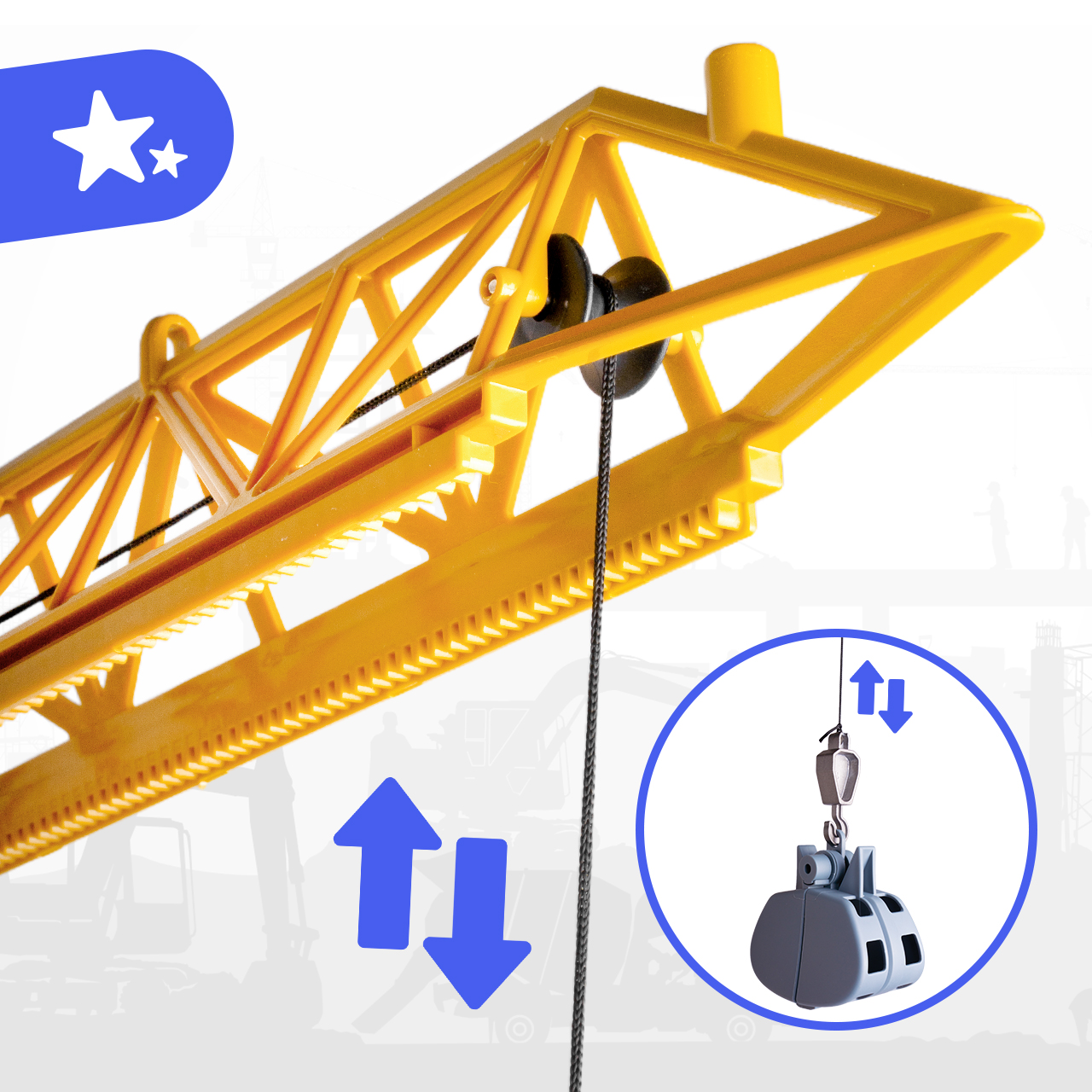 Ergonomiczny pilot z dużymi przyciskami sprawia, że manewry są intuicyjne: obracasz wieżę w lewo/prawo oraz podnosisz i opuszczasz hak z czerpakiem – zupełnie jak operator na budowie.