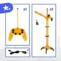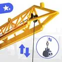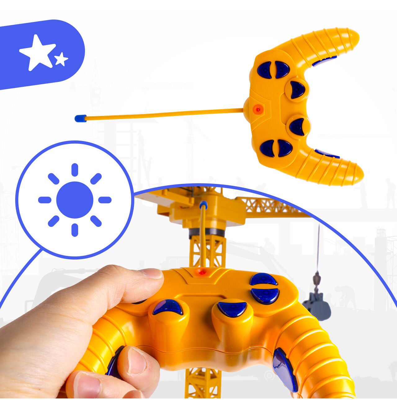 Ergonomiczny pilot z dużymi przyciskami sprawia, że manewry są intuicyjne: obracasz wieżę w lewo/prawo oraz podnosisz i opuszczasz hak z czerpakiem – zupełnie jak operator na budowie.