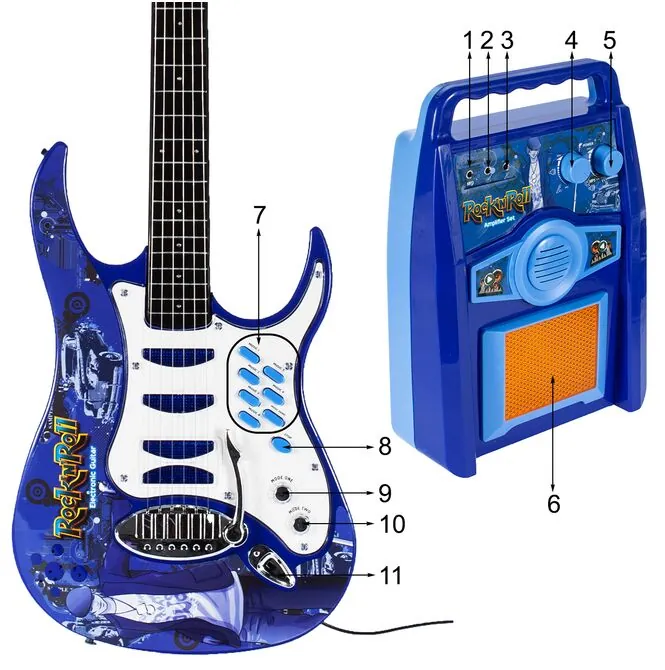 Zasilanie gitary: 3x bateria AA (brak w zestawie) Zasilanie wzmacniacza: 3x bateria AA (brak w zestawie)