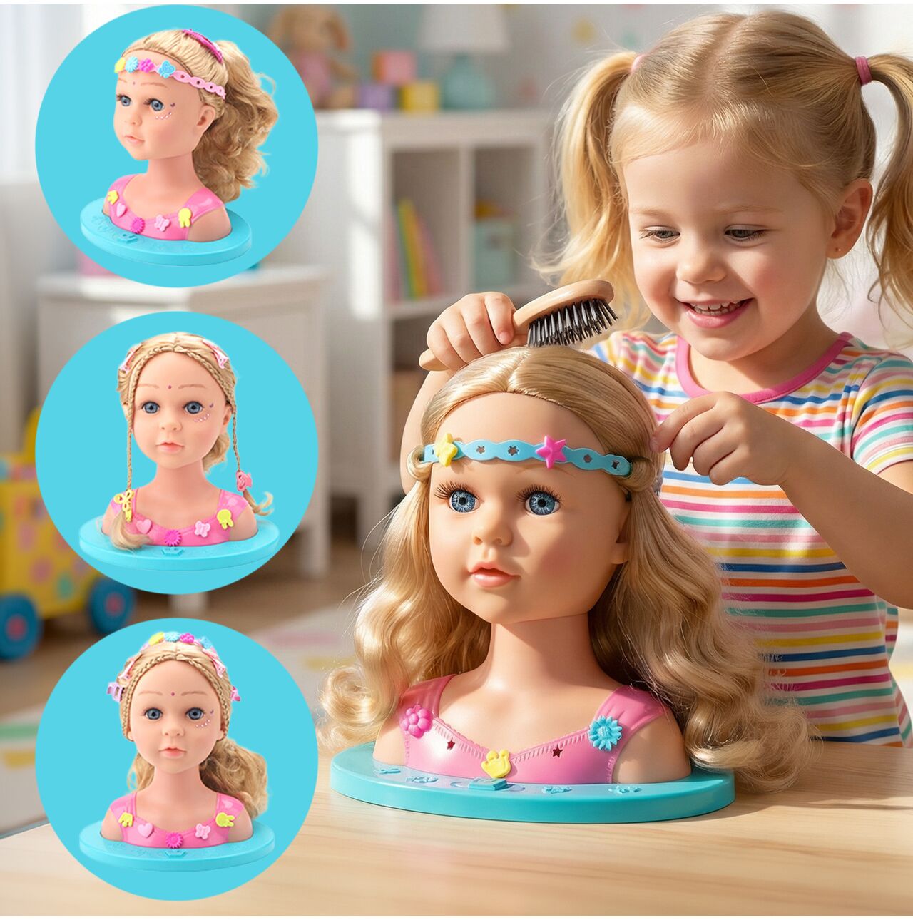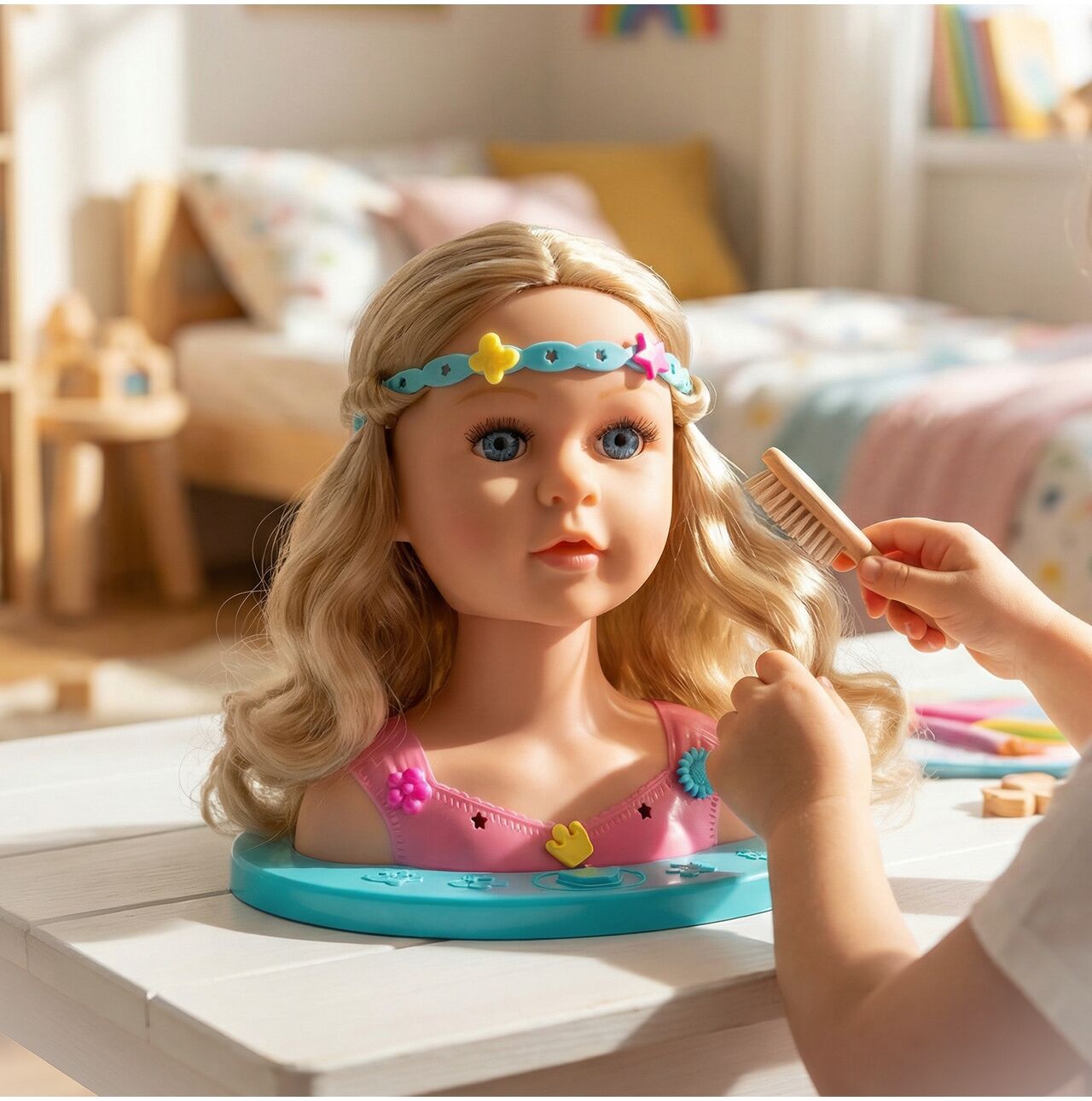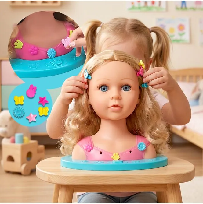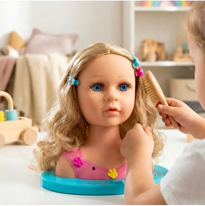 Dziecko może ćwiczyć pierwsze warkocze, uczyć się spinania włosów i eksperymentować z różnymi stylami – bez stresu i bez ciągnięcia własnych włosów.