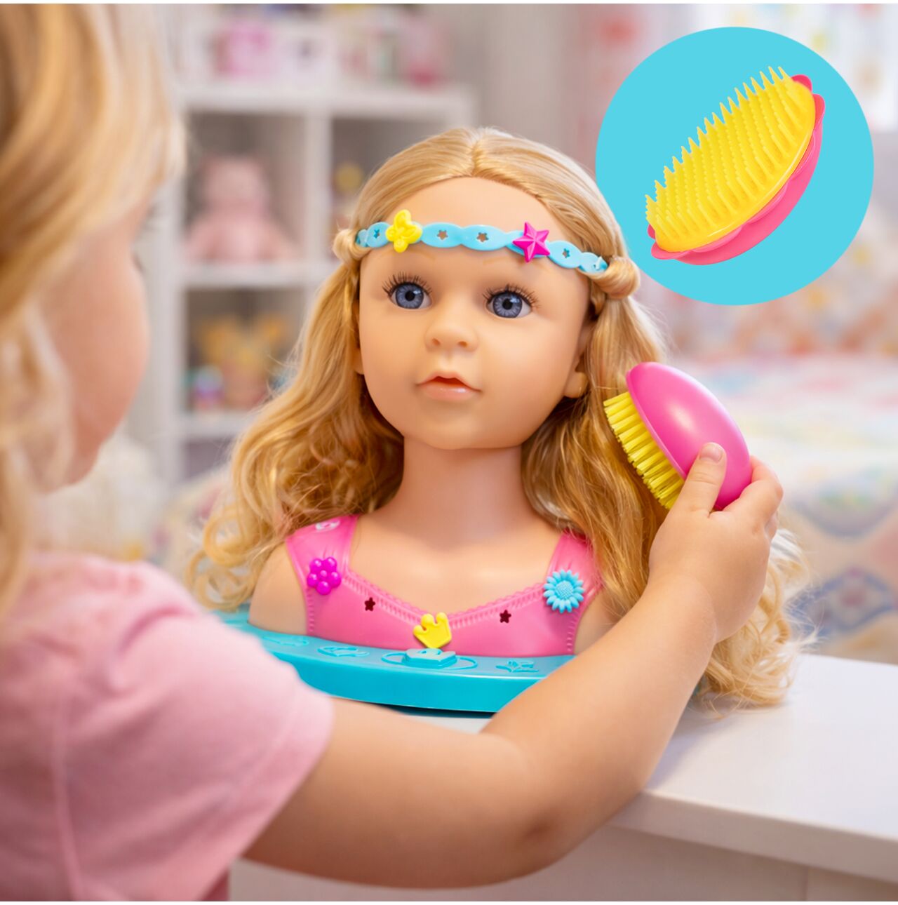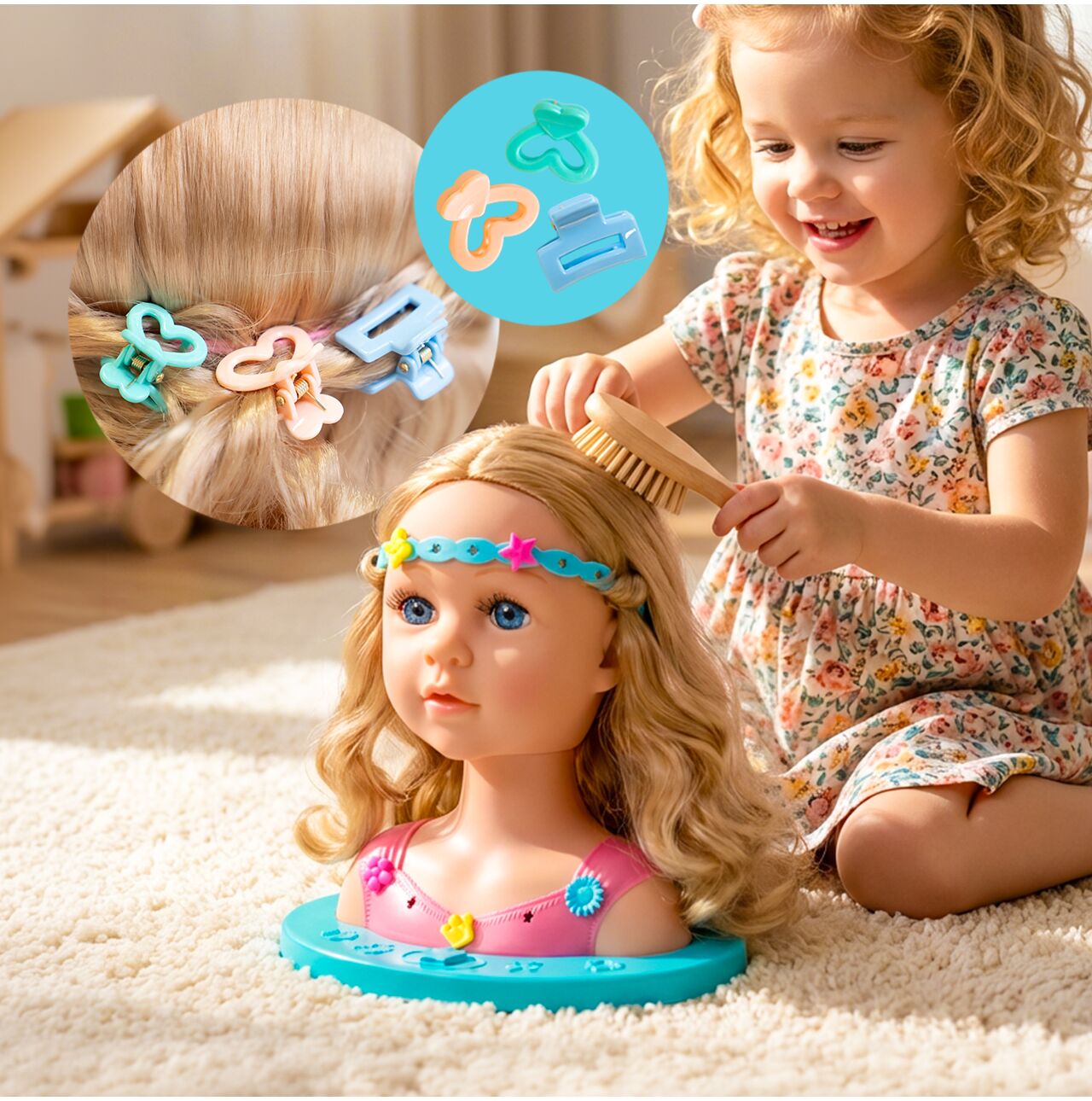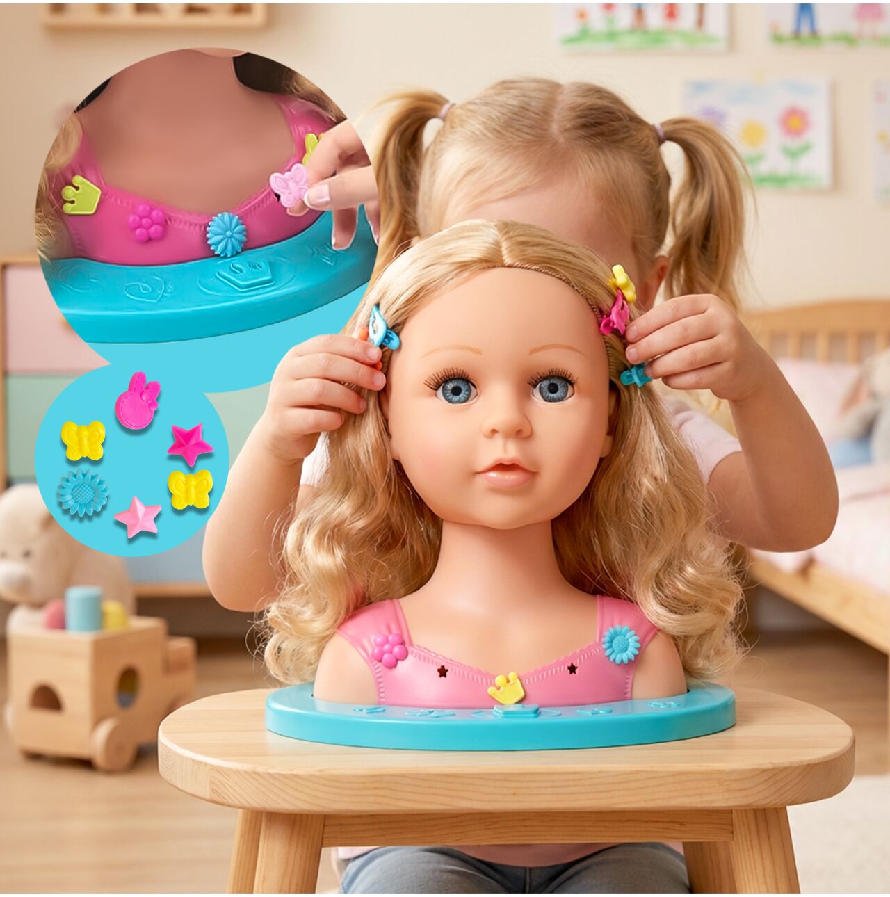 Dziecko może ćwiczyć pierwsze warkocze, uczyć się spinania włosów i eksperymentować z różnymi stylami – bez stresu i bez ciągnięcia własnych włosów.