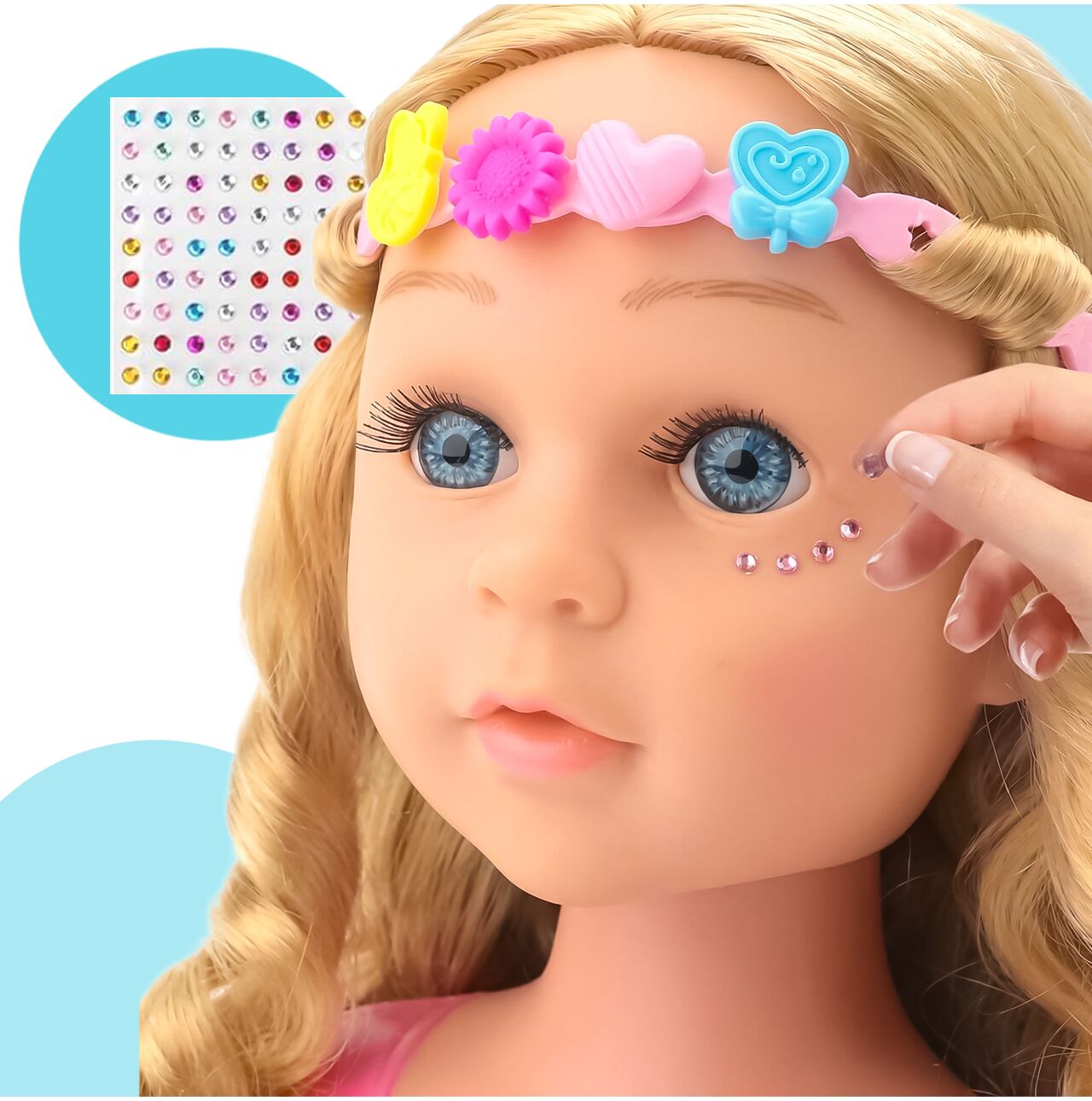 - realistyczna głowa lalki z długimi, blond włosami idealnymi do czesania i zaplatania