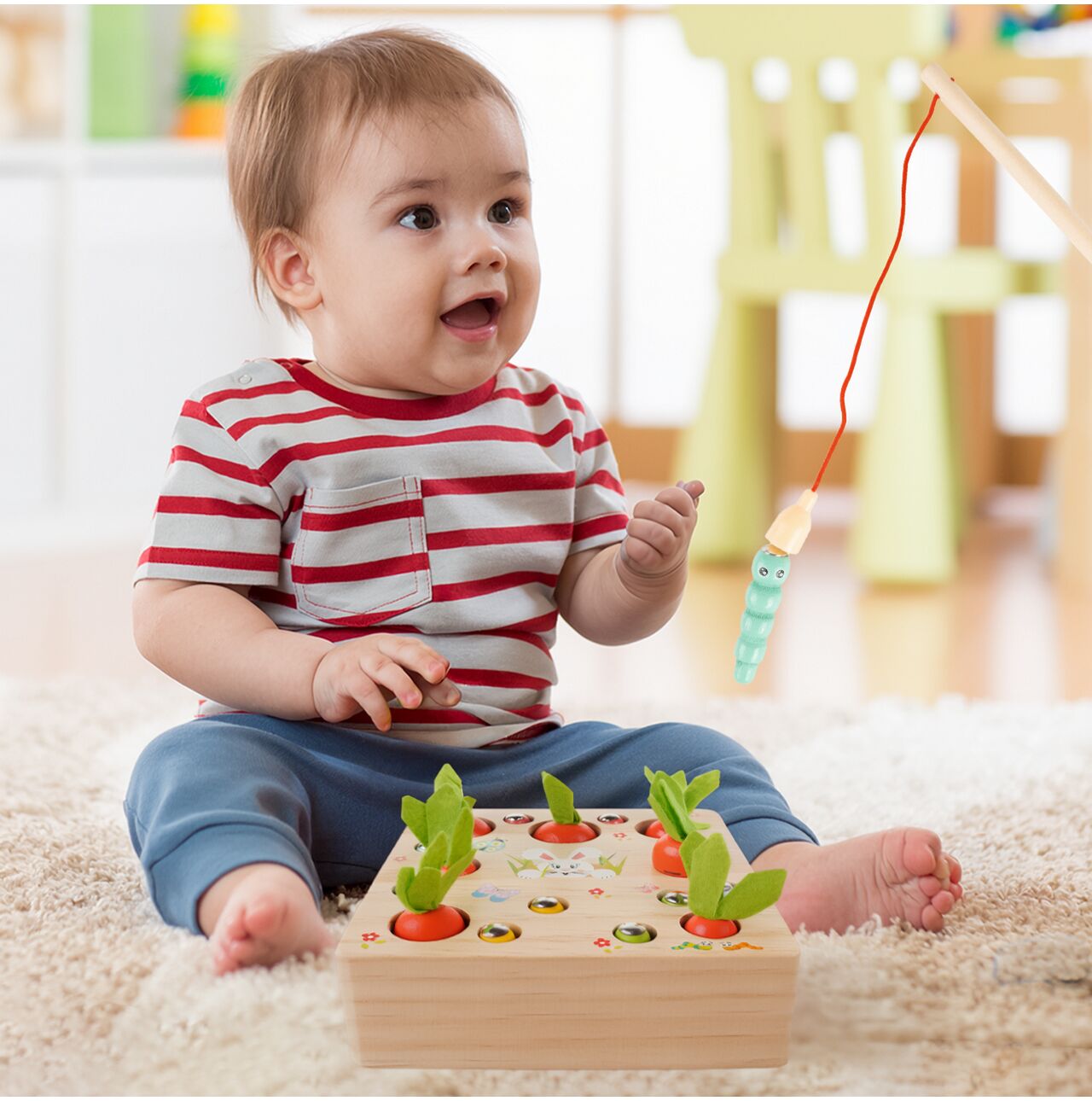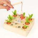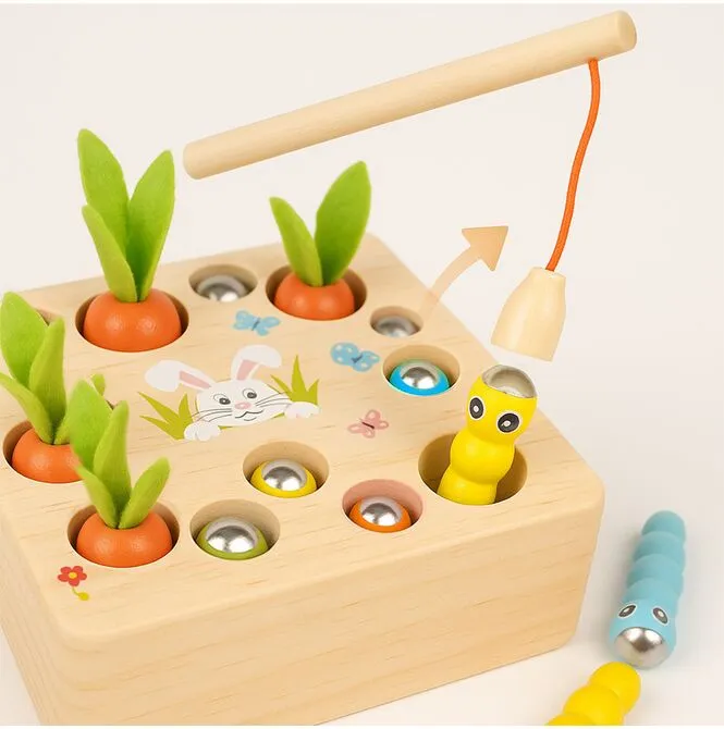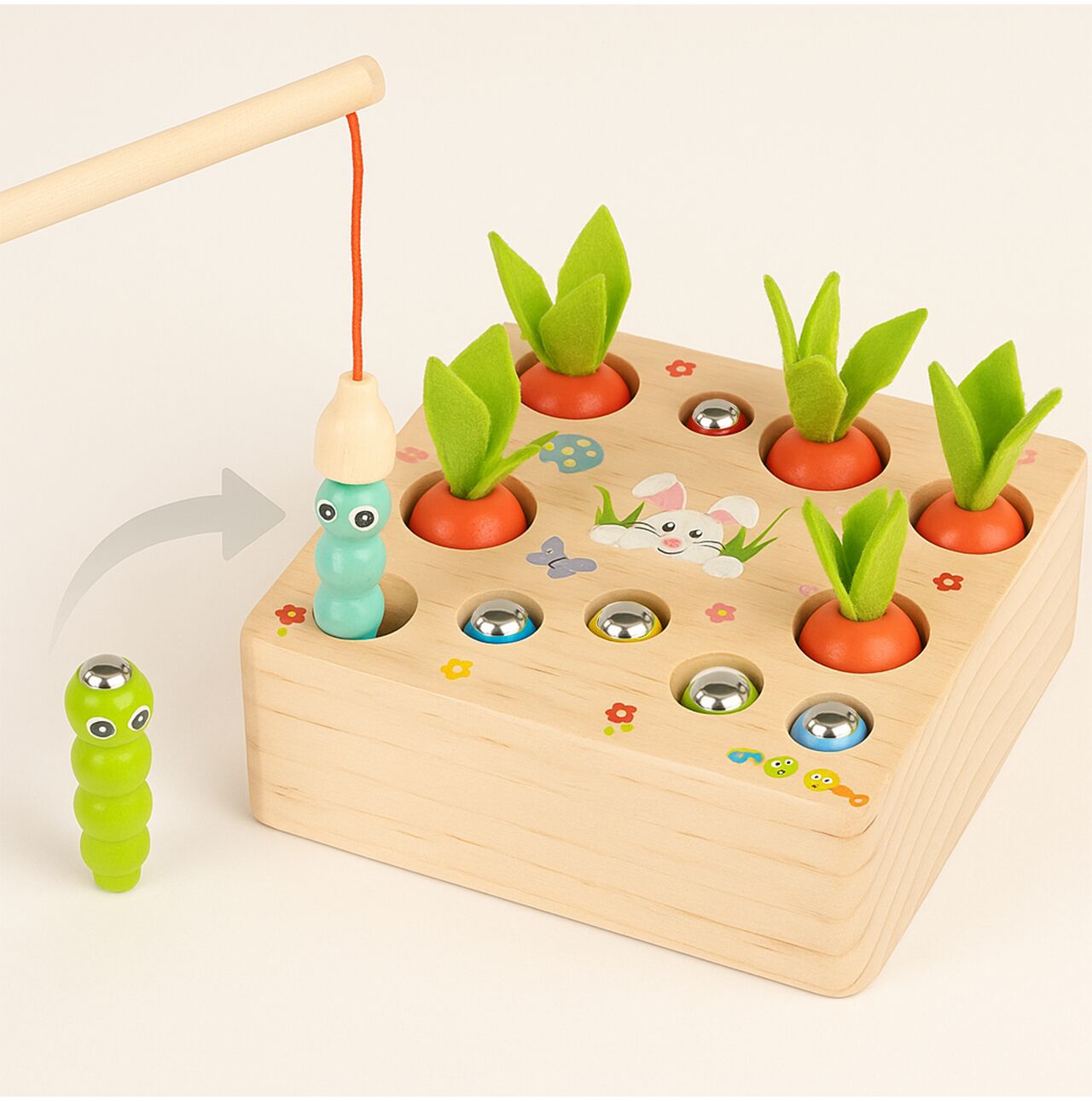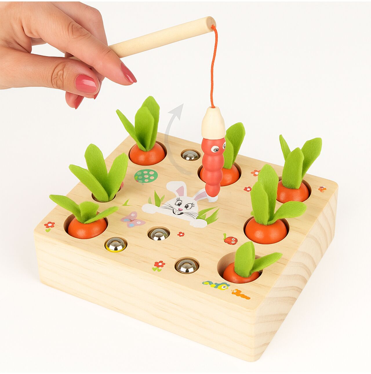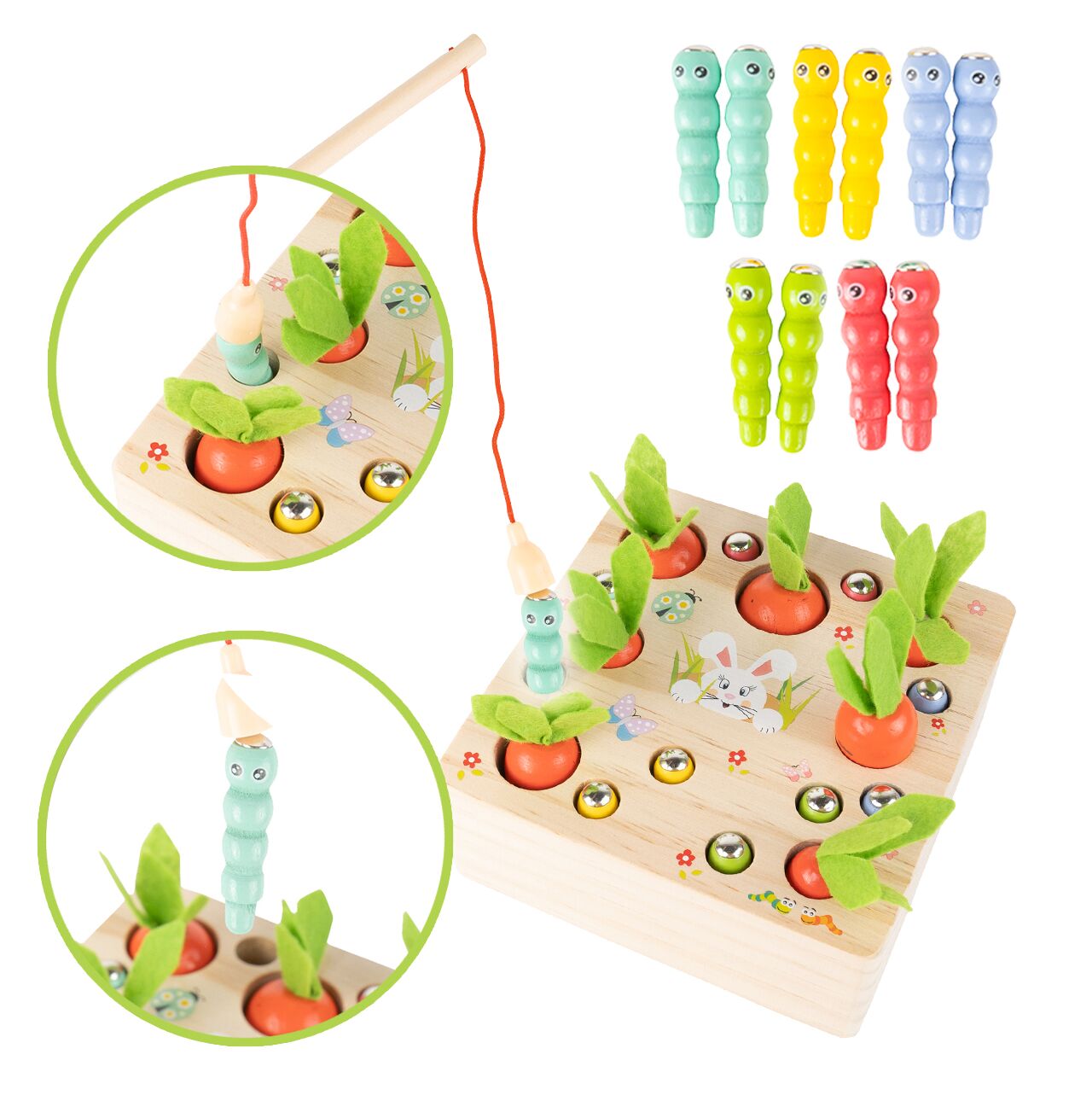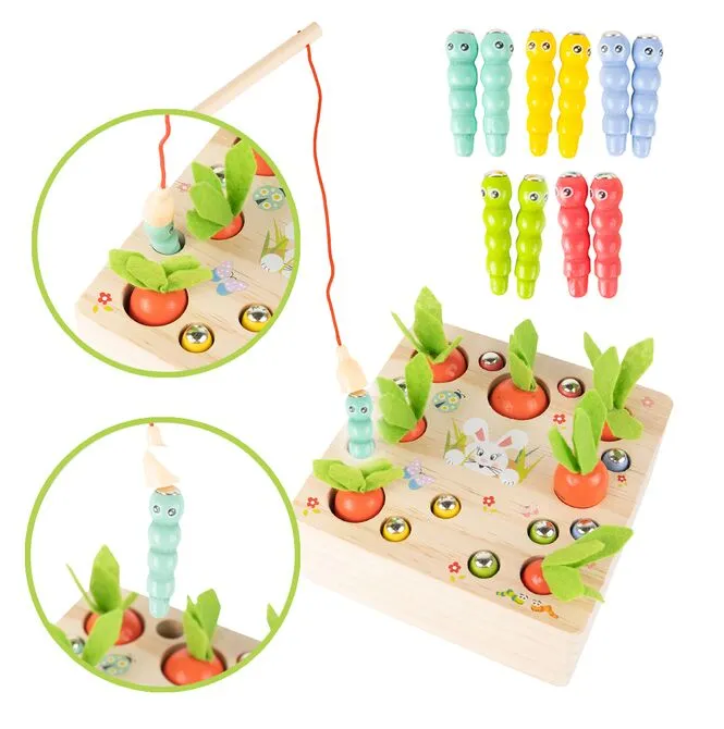 Zabawka nadaje się do zabawy solo (ćwiczenie koncentracji) lub w parach (kto szybciej złowi wszystkie robaczki?). Można tworzyć konkursy, scenki z życia w ogródku, a nawet naukę liczenia z marchewkami i robaczkami!