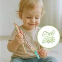 Intensywne barwy (zielony, czerwony, żółty, niebieski), różne tekstury (drewno, filc, metal), a także rysunki owadów i królika stymulują wzrok, dotyk i wyobraźnię. Dziecko może poznawać kolory i uczyć się ich rozróżniania.