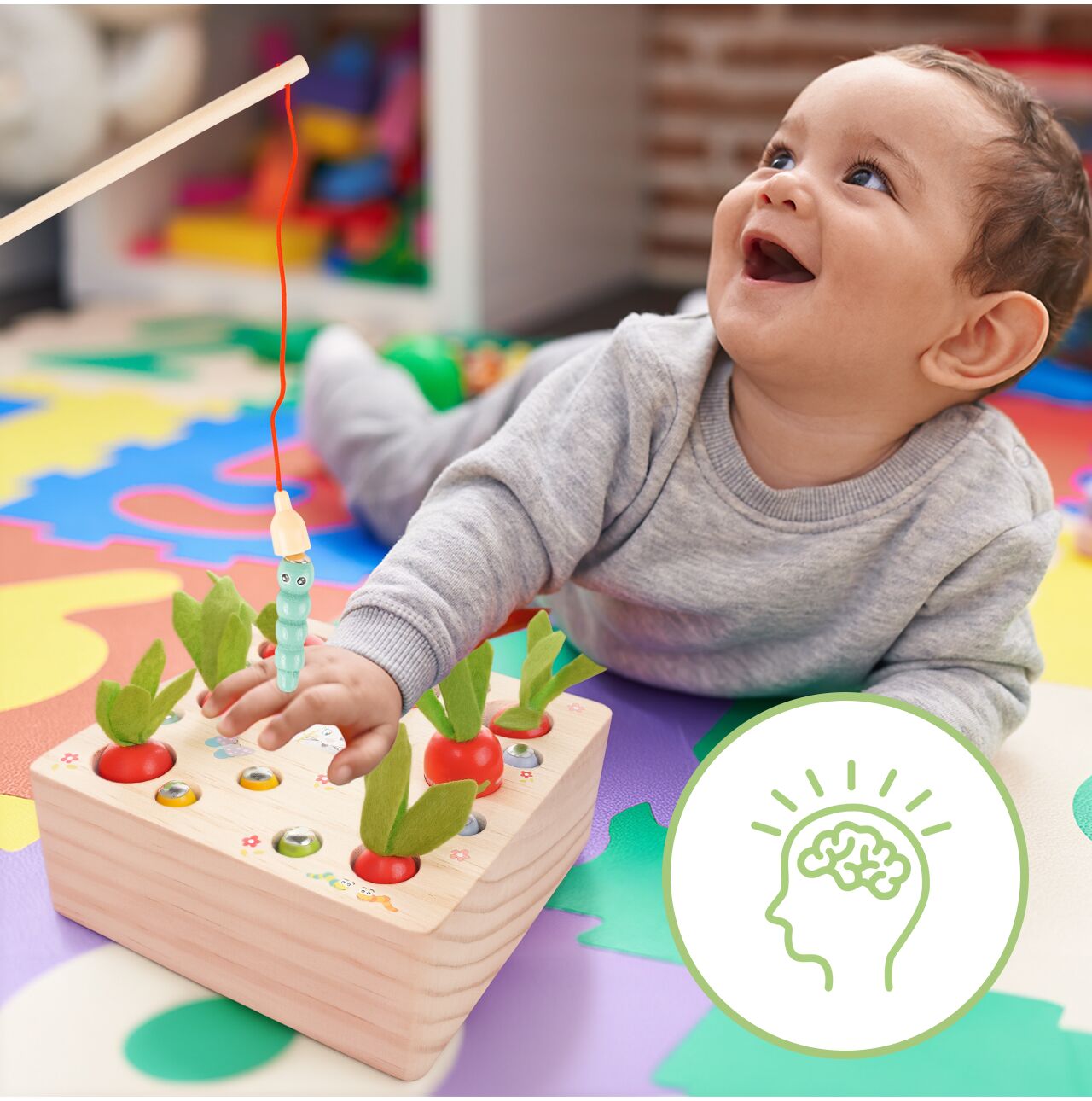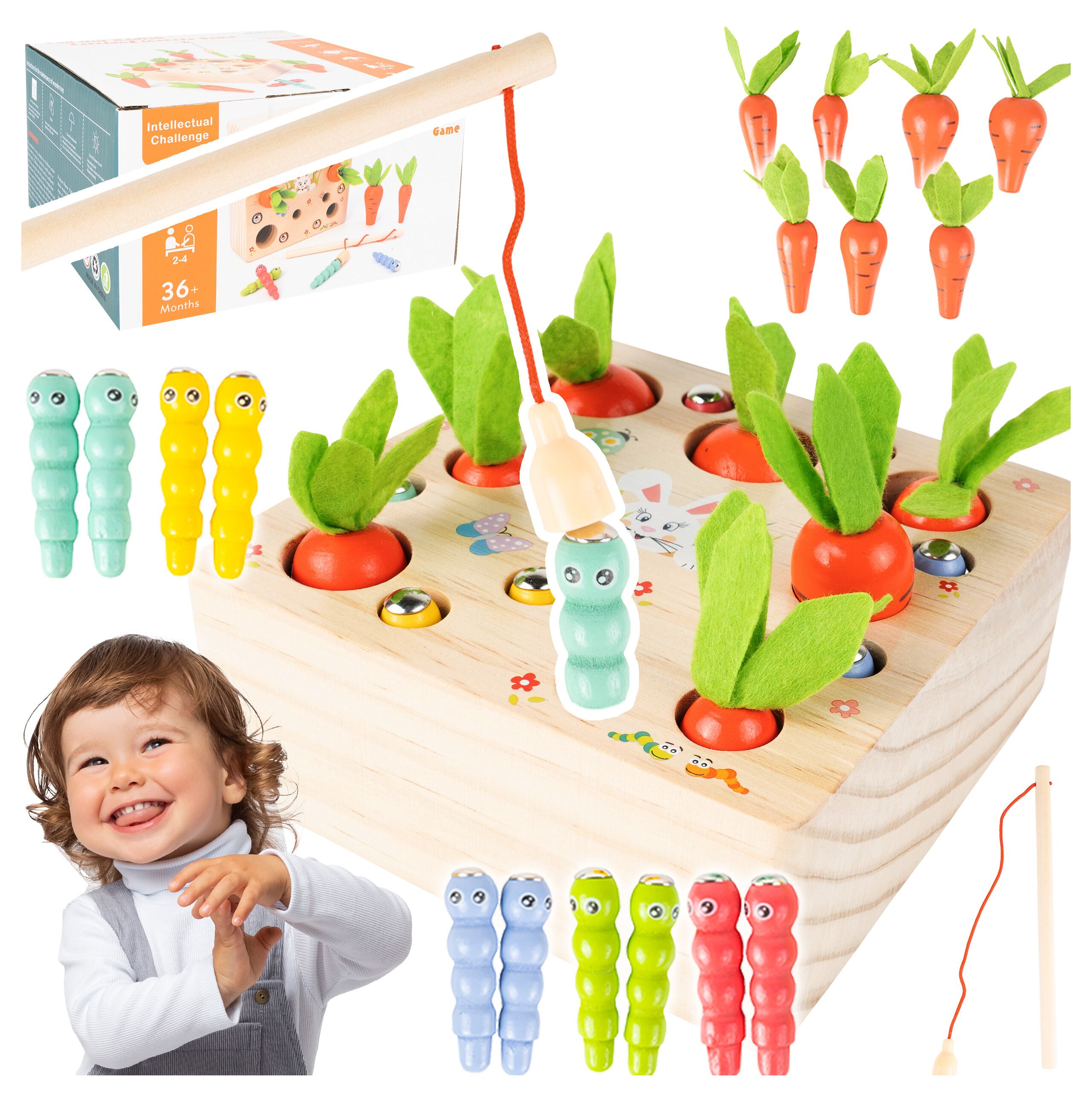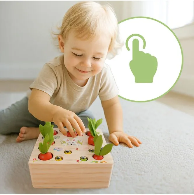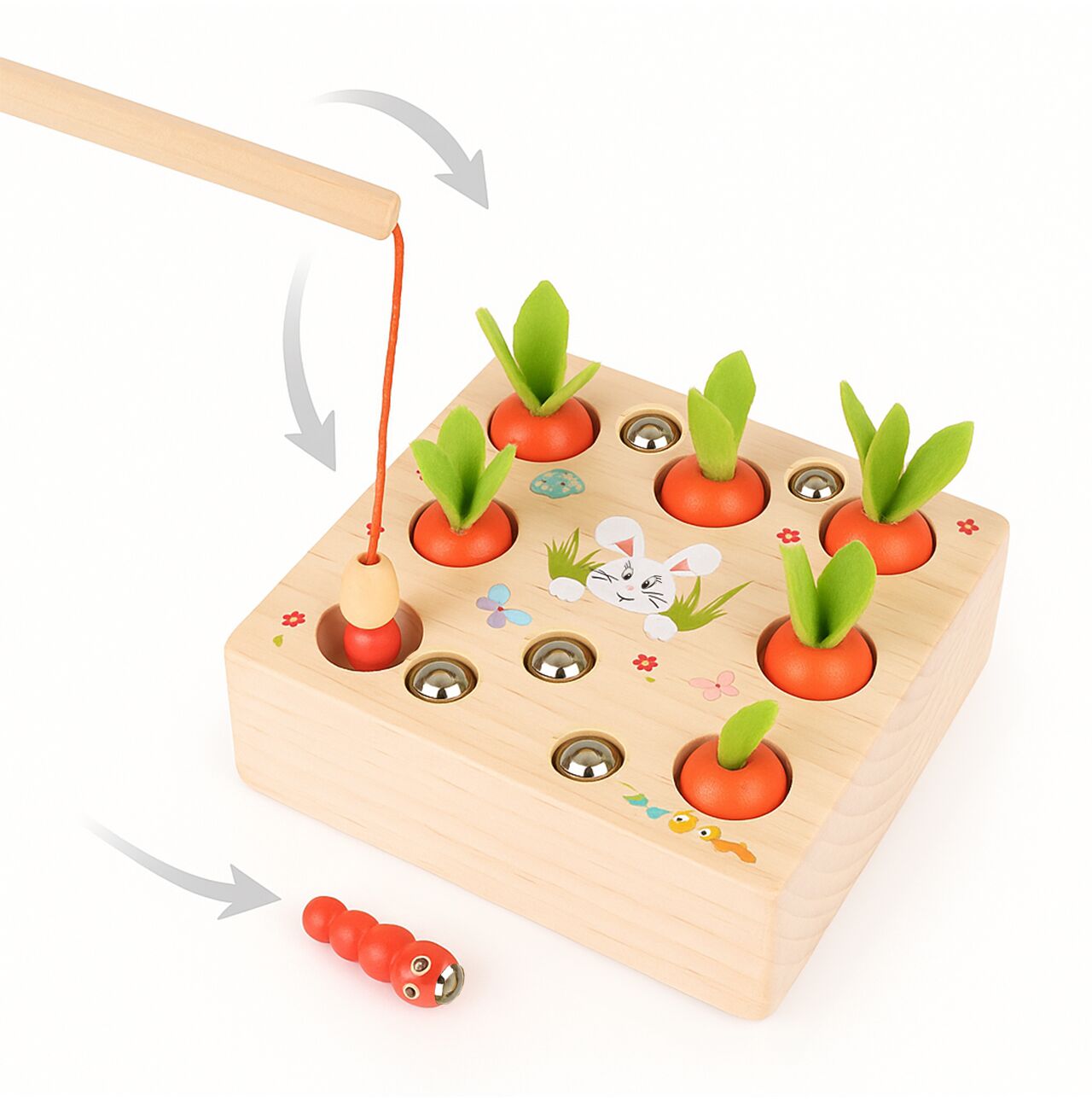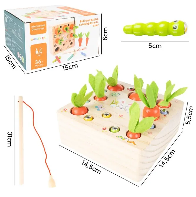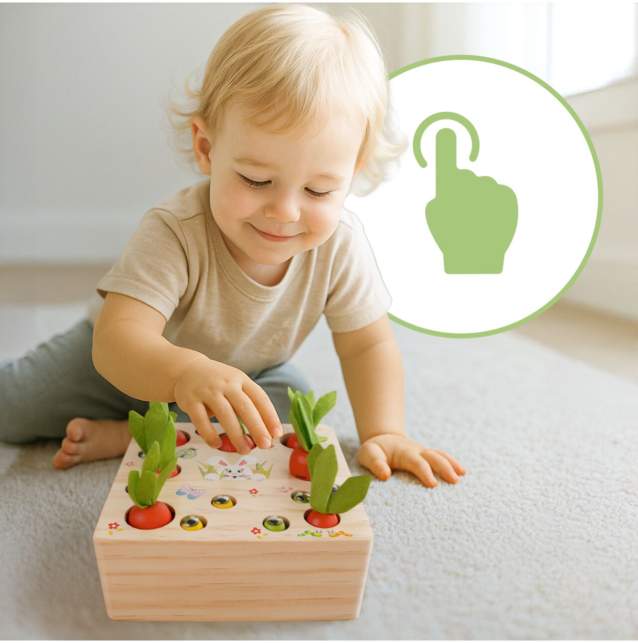 Zabawka zawiera 7 marchewek o różnej wielkości, które należy dopasować do odpowiednich otworów w skrzynce. Dziecko uczy się poprzez próbę i błąd, rozwijając cierpliwość oraz wyobraźnię przestrzenną.