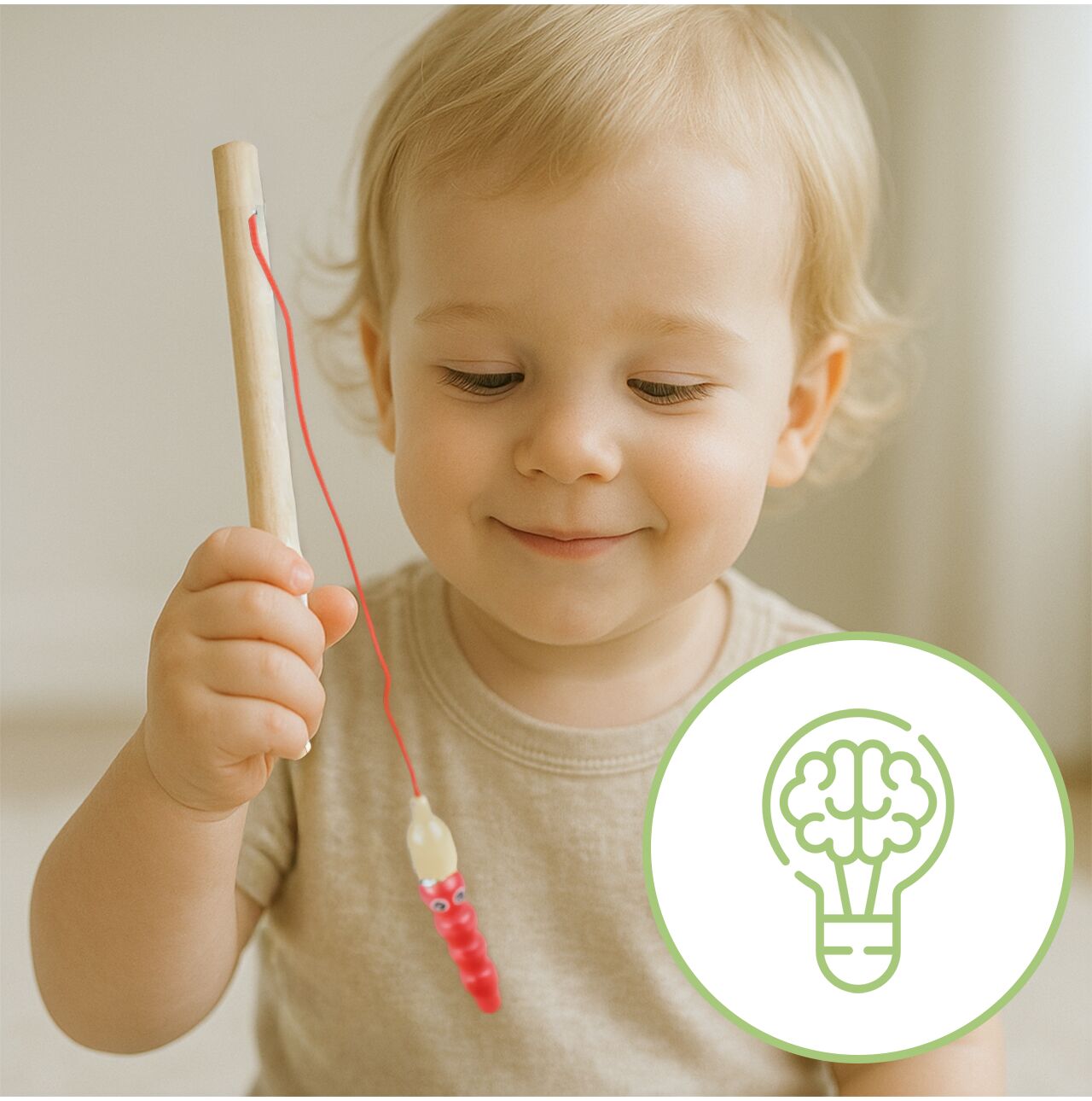 Zabawa w łowienie robaczków za pomocą magnetycznej wędki to świetne ćwiczenie dla małych rączek i oczu. Dziecko musi precyzyjnie trafić końcówką wędki, co rozwija koncentrację i zręczność.