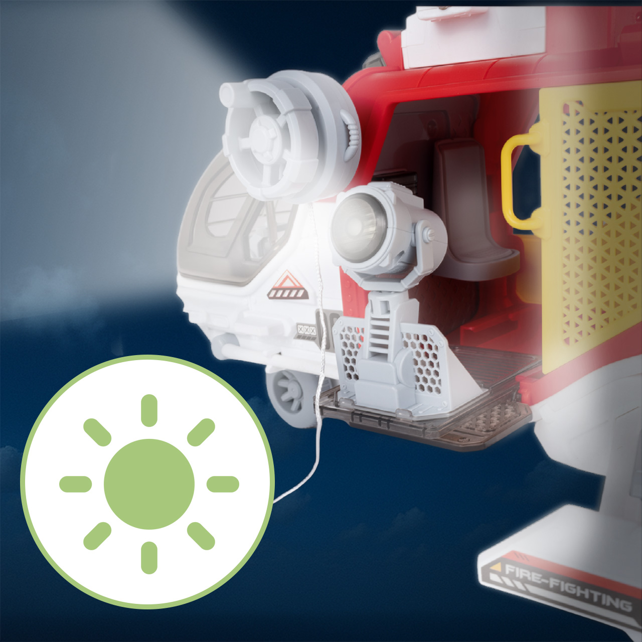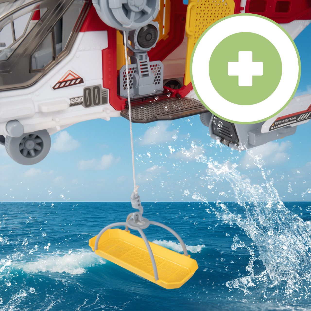 Najbardziej emocjonująca część misji? Wciągarka z hakiem i koszem. Dziecko może opuścić kosz, podjąć „poszkodowanego” lub towar i bezpiecznie wciągnąć go na pokład. Prosta, mechaniczna obsługa uczy koordynacji i daje satysfakcję z udanej akcji.