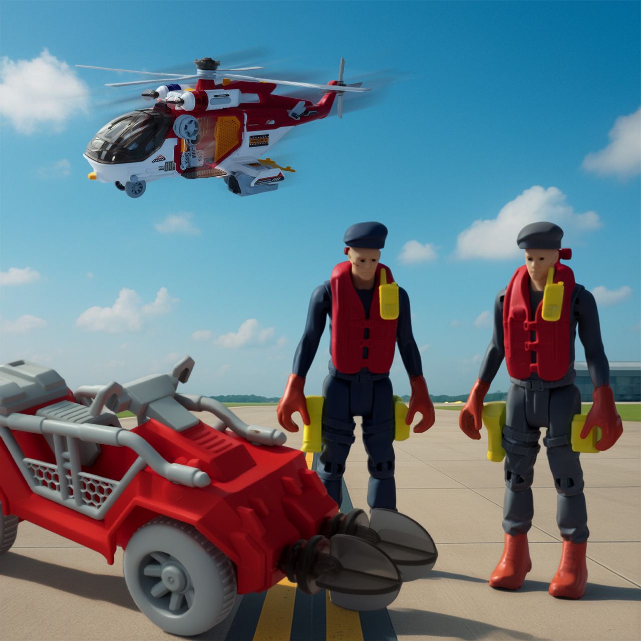 Nie każda misja kończy się w powietrzu. Figurka ratownika na quadzie błyskawicznie dojeżdża tam, gdzie śmigłowiec nie może wylądować. Ruchome elementy ułatwiają ustawianie realistycznych scenek, a maluchy uczą się planowania: kto leci, kto jedzie i jak współpracuje cały zespół.