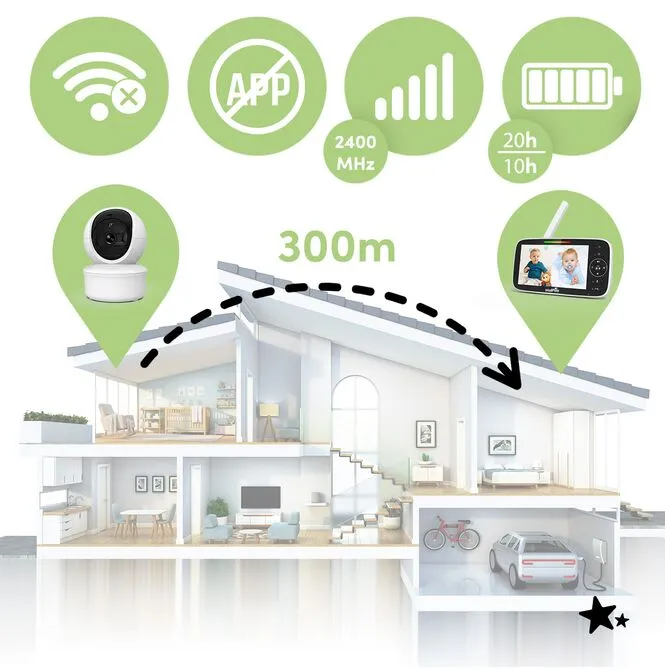 Obraz i dźwięk przesyłane są lokalnie wyłącznie między kamerą a monitorem NannyEye Complex 5,0” HD.