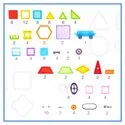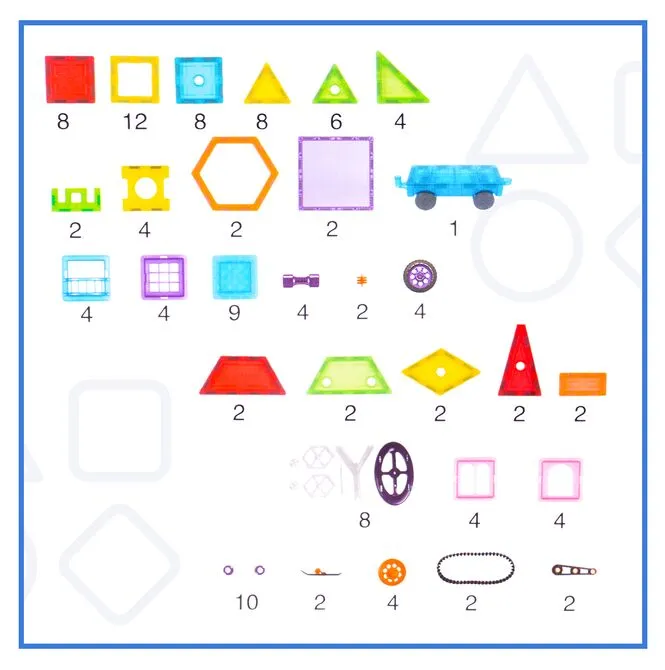 - Płytki magnetyczne: kwadraty, trójkąty (różne typy), sześciokąty – łącznie ok. 100 szt.