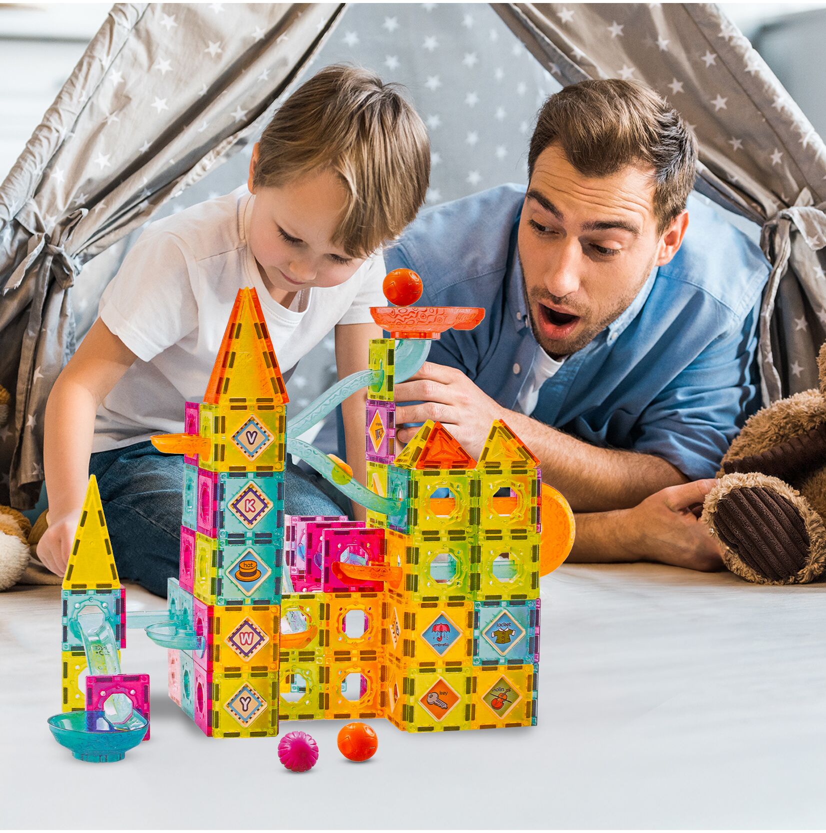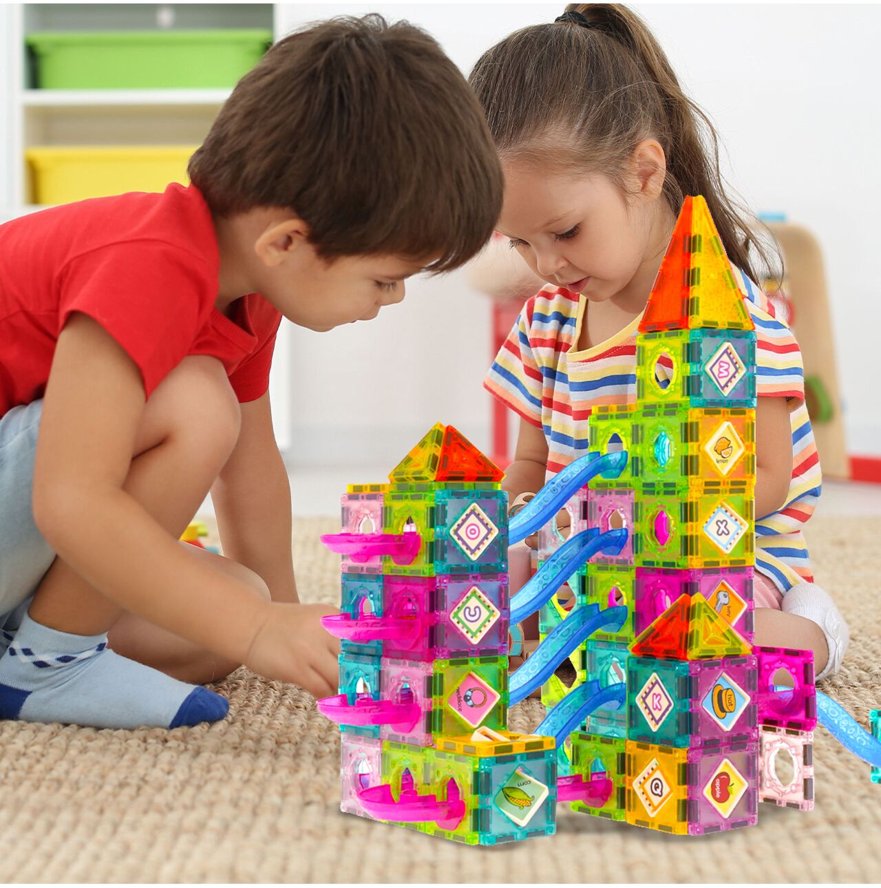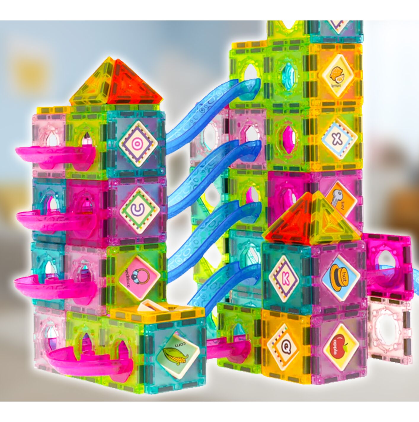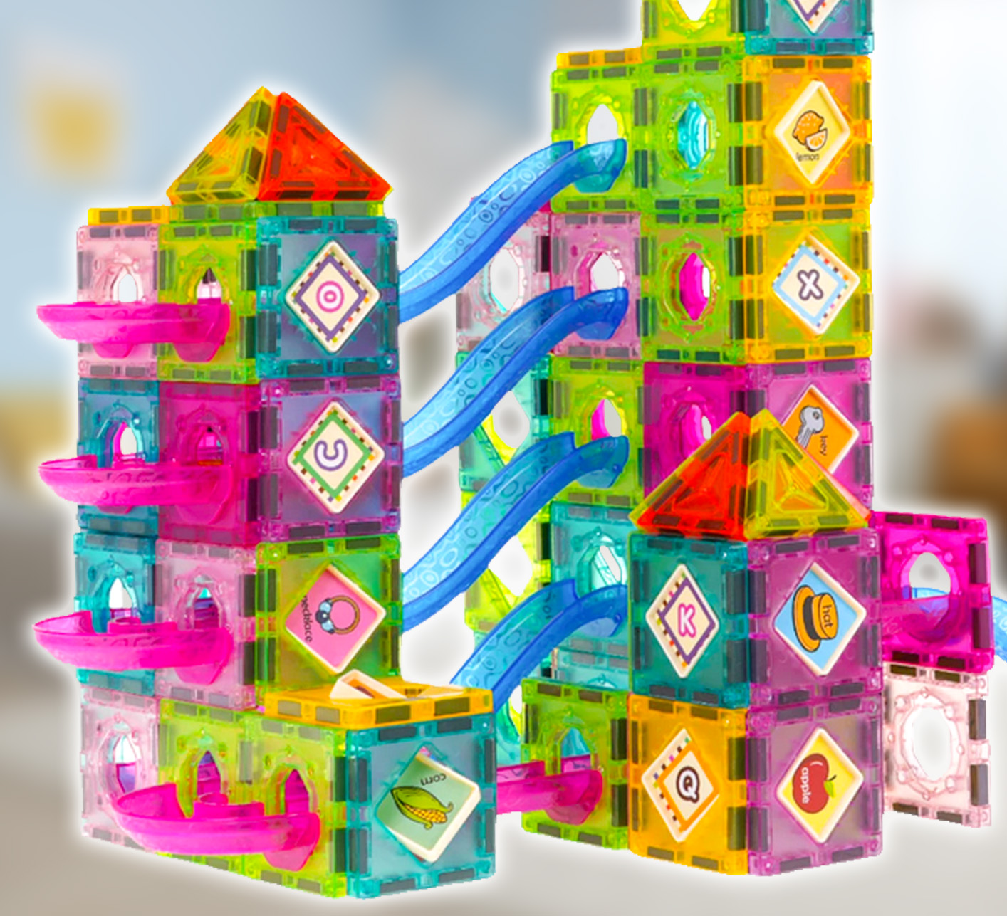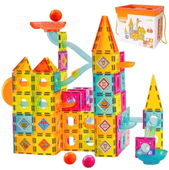 - Kulodrom + klocki 3D w jednym – rampy, rynny i miski łączą się z płytkami magnetycznymi, tworząc widowiskowe zjazdy kulek.