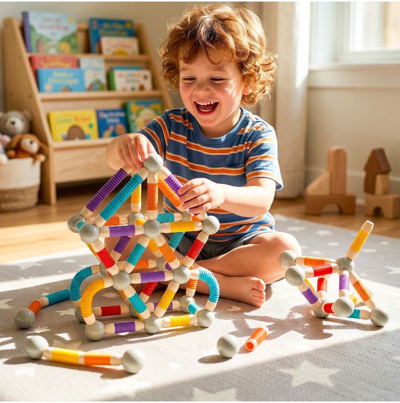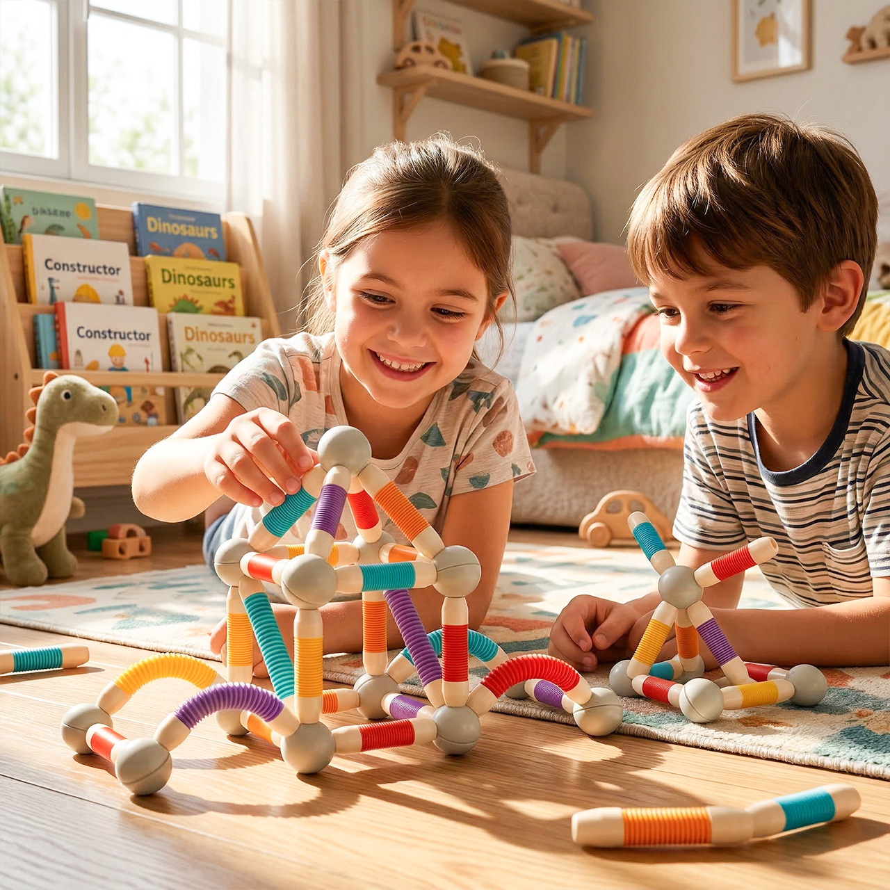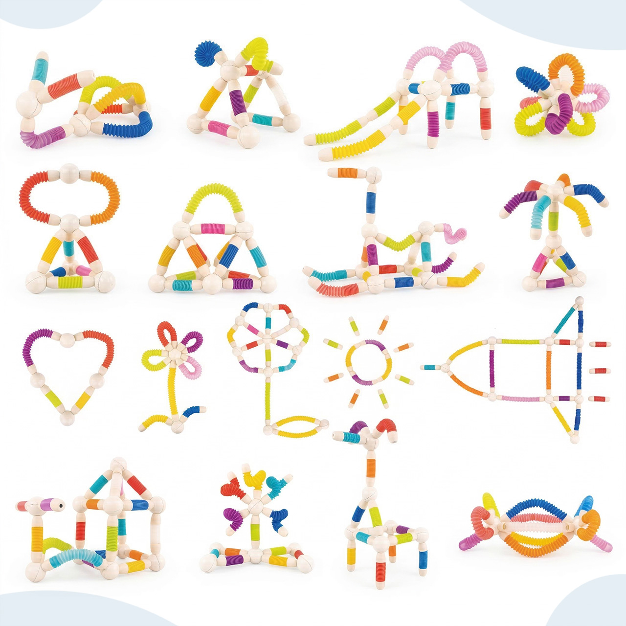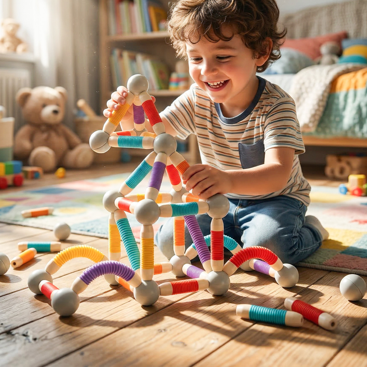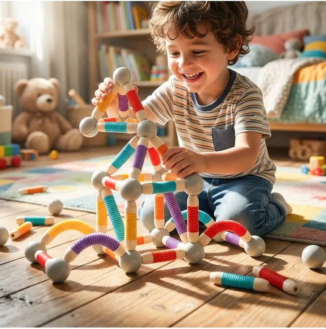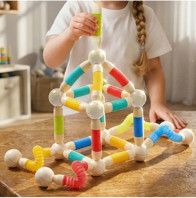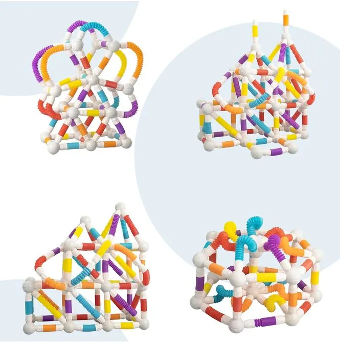 W komplecie znajdują się kolorowe elastyczne rurki oraz kuliste łączniki magnetyczne, dzięki którym można tworzyć zarówno proste figury, jak i bardziej rozbudowane konstrukcje 3D. Dziecko może odtwarzać przykłady ze zdjęć albo budować całkowicie własne projekty. Ten zestaw sprawdza się w zabawie solo, z rodzeństwem, z rodzicem, a nawet w grupie. To świetna opcja na kreatywne popołudnie bez nudy.