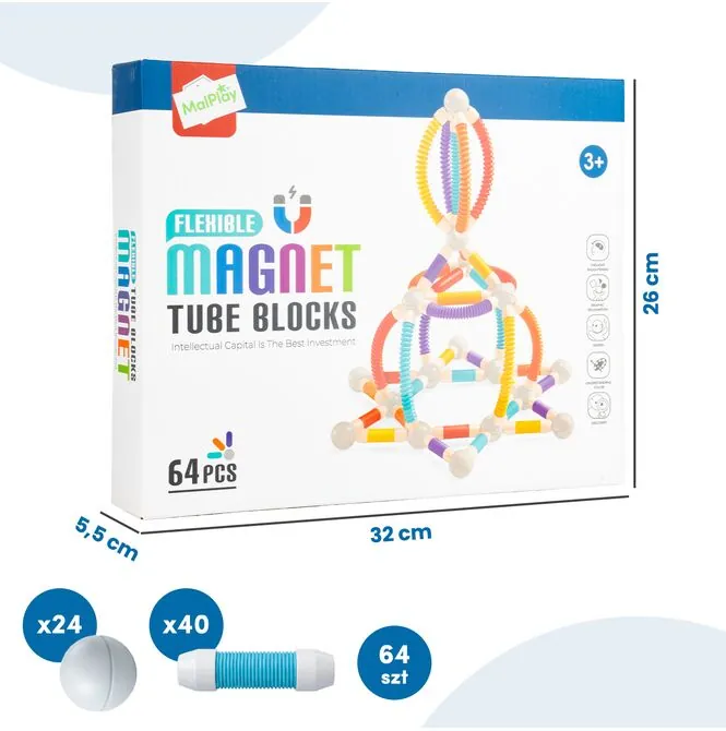 KLOCKI MAGNETYCZNE RURKI 64 EL. ELASTYCZNE KONSTRUKCYJNE 3D DLA DZIECI 3+
