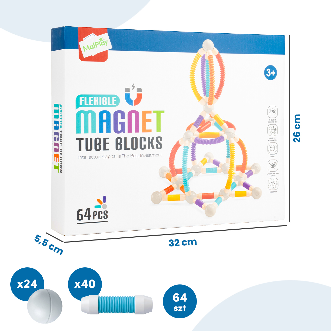 • 64 elementy (elastyczne rurki i kuliste łączniki magnetyczne)