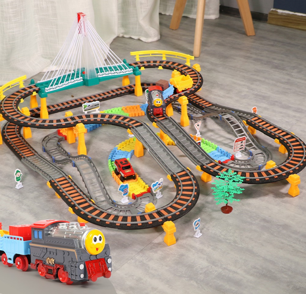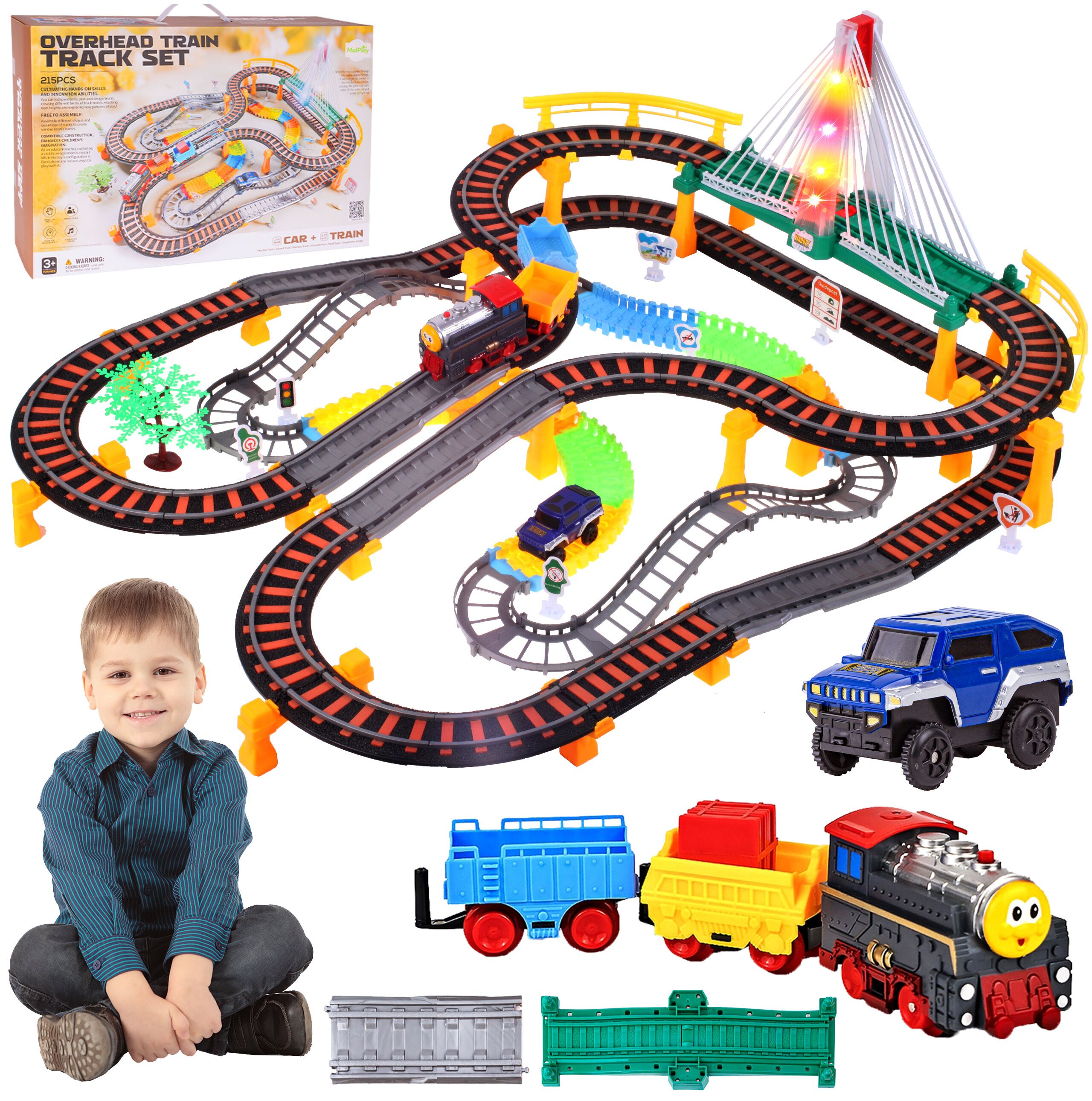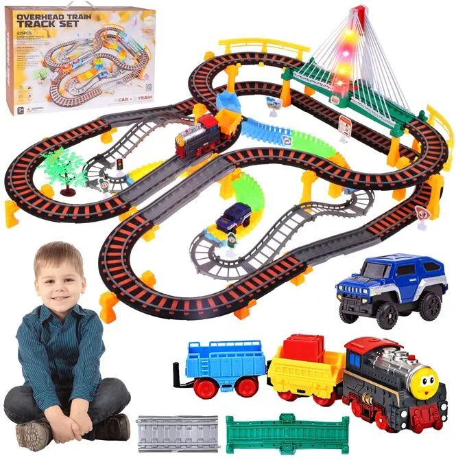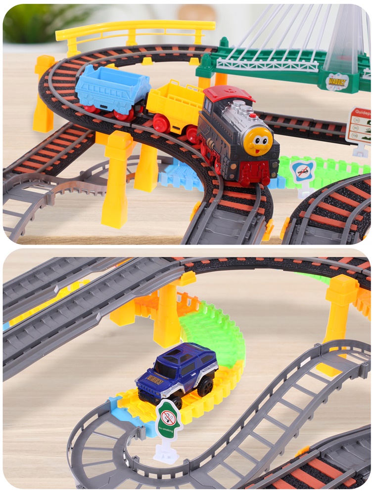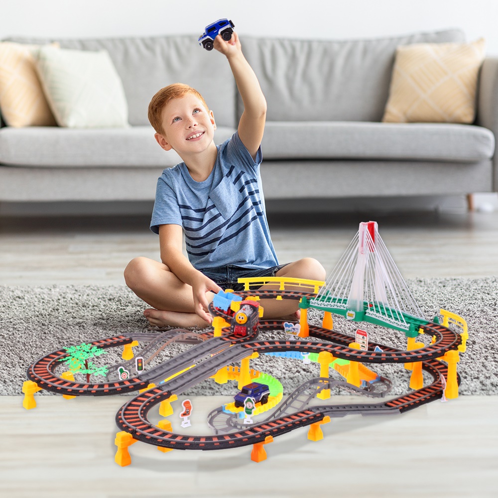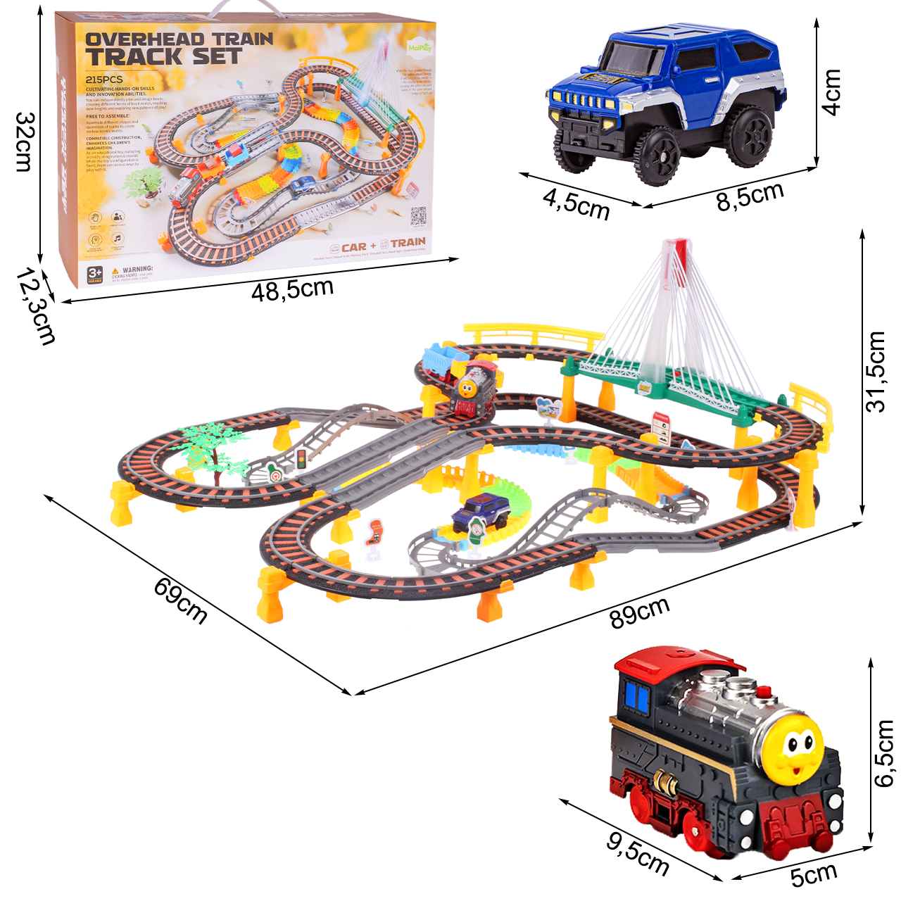 ✅Zestaw został wyposażony w: dwupoziomowy tor kolejowy, tor samochodowy, lokomotywę z wagonami, samochód oraz w wiele innych akcesoriów.