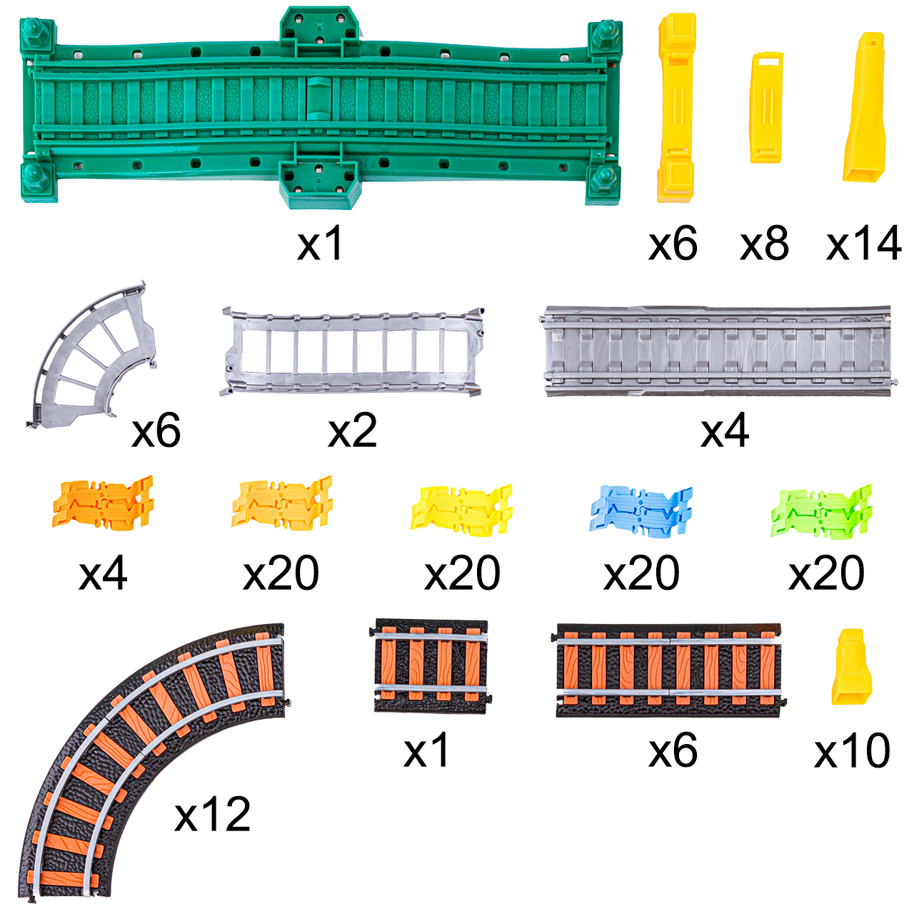 Kolejka posiada wiele różnych elementów, dzięki czemu tory można układać w najróżniejsze przeszkody. W zestawie jest aż 192 elementy co pozwala na różnorodne konfiguracje!