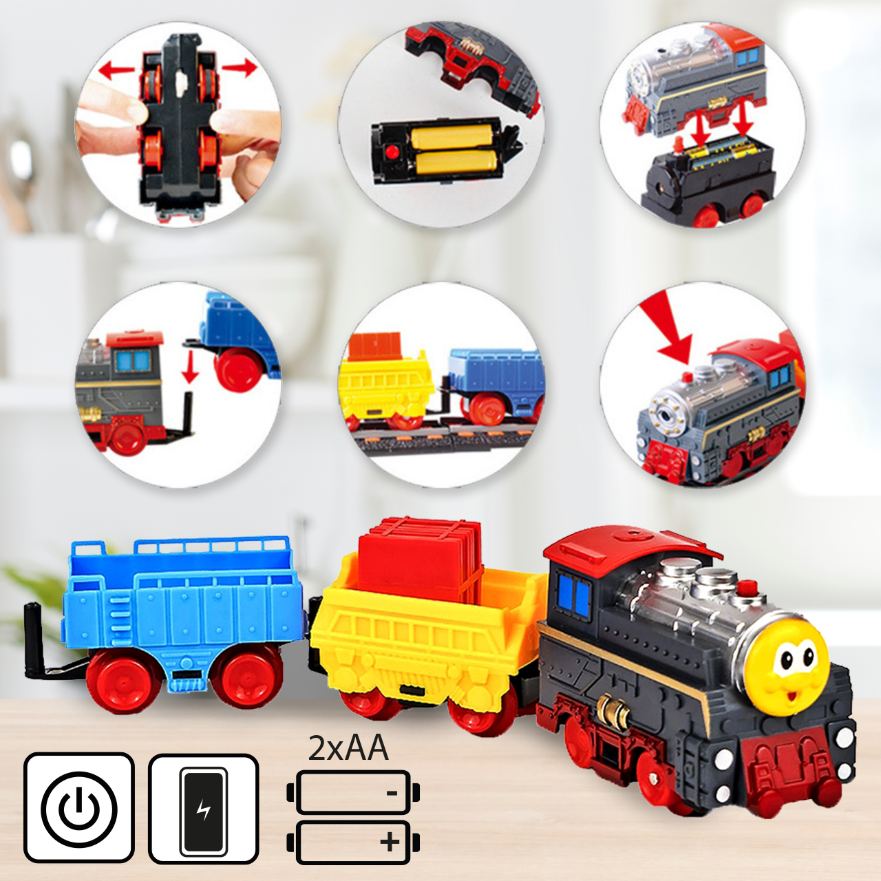 ✅Lokomotywa porusza się, ciągnie wagoniki i wydaje dźwięk imitujący ten jaki rzeczywiście wydaje lokomotywa pociągu. 3 odczepiane wagony pozwalają na dowolne konfiguracje, wg własnego pomysłu.