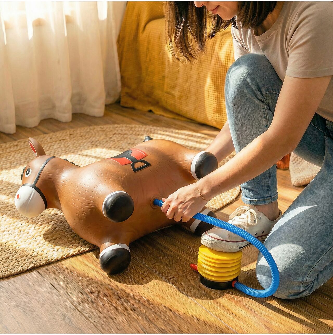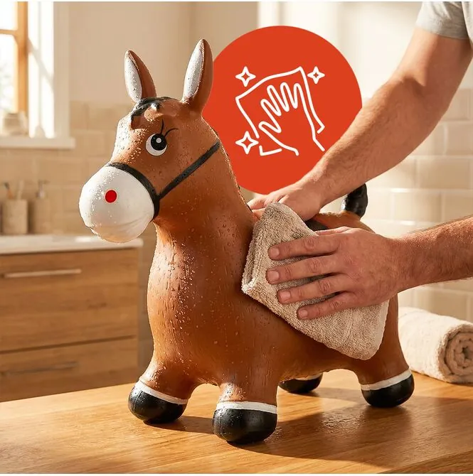 To zabawka, która sprawdza się nie tylko dla dziecka, ale też jest wygodna dla rodzica. Koń jest prosty do napompowania, a jego powierzchnia łatwa do utrzymania w czystości — wystarczy szybkie przetarcie, by znów wyglądał świetnie. To realna przewaga nad wieloma zabawkami materiałowymi, które trudniej odświeżyć po intensywnej zabawie. Tutaj wszystko jest praktyczne, szybkie i wygodne w codziennym użytkowaniu.