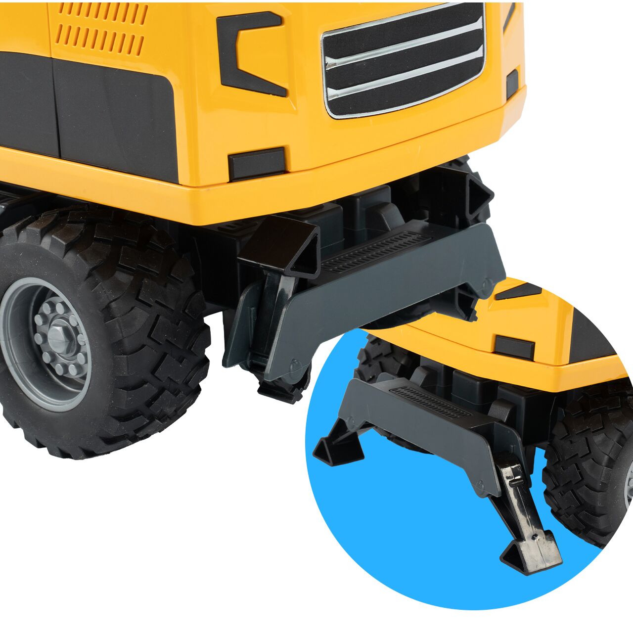Przedni lemiesz oraz stabilizujące podpory dodają zabawce realizmu i sprawiają, że koparka wygląda jak prawdziwy sprzęt budowlany. Dzięki temu dziecko może jeszcze lepiej odgrywać scenki z placu budowy, załadunku i robót ziemnych. Takie detale robią ogromną różnicę, bo to właśnie one budują efekt prawdziwej maszyny.