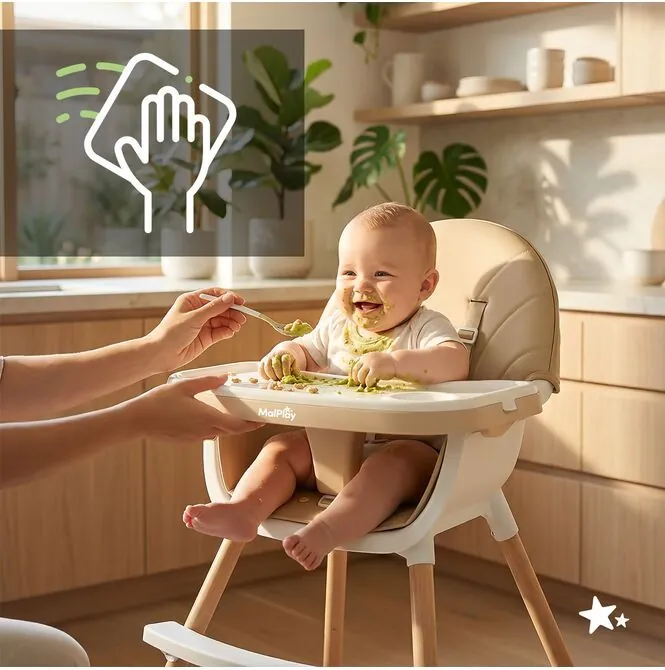 Regulowana odległość tacki od oparcia (odległość od 18cm do 22cm) pozwala idealnie dopasować przestrzeń do potrzeb rosnącego dziecka. Dzięki temu maluch zyskuje większy komfort podczas pierwszych prób samodzielnego jedzenia, a Ty łatwiej dostosujesz ustawienie blatu do wieku i postury dziecka. Dodatkowo, zdejmowana nakładka sprawia, że czyszczenie po posiłkach jest szybkie i bezproblemowe.