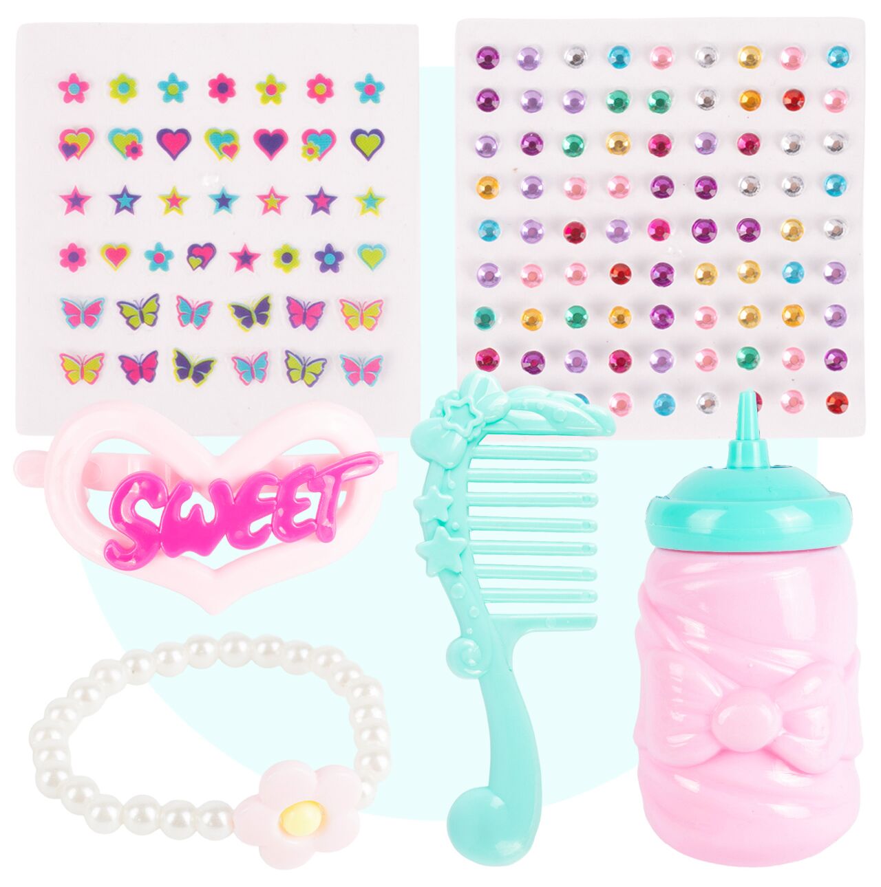 - Akcesoria w zestawie: butelka, grzebień, naklejki, koraliczki ozdobne, spinka