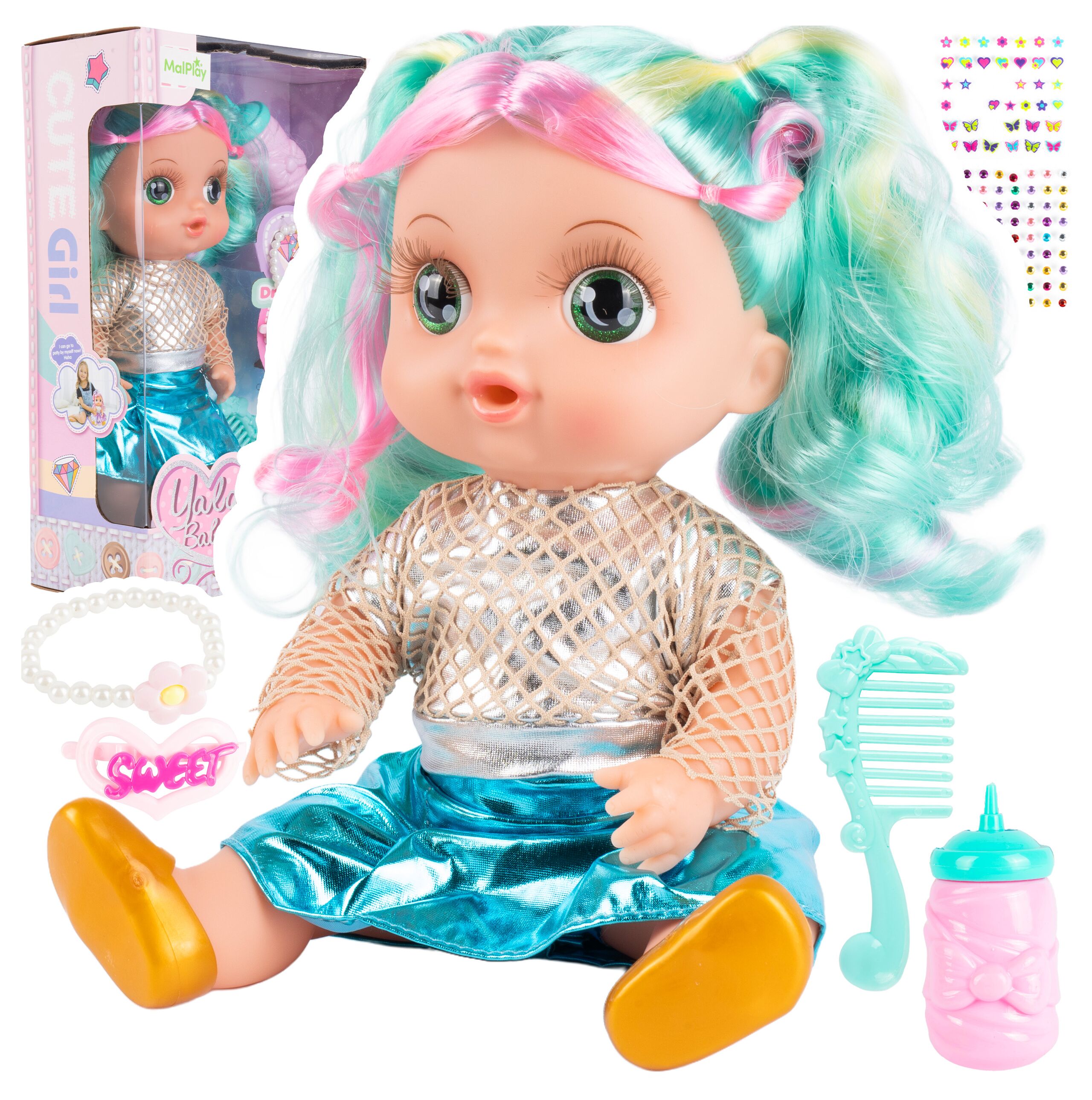 LALKA 30 CM DO CZESANIA PIJE Z BUTELKI AKCESORIA KOLOROWE WŁOSY NAKLEJKI