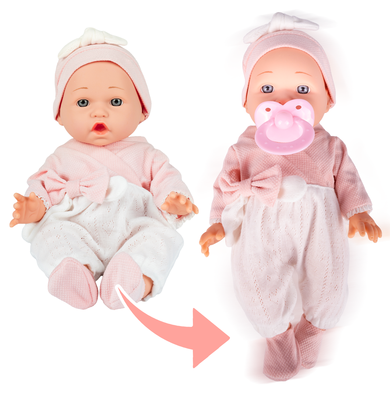 - Smoczek pasujący do ust lalki – element odgrywania ról jak u prawdziwego bobaska.