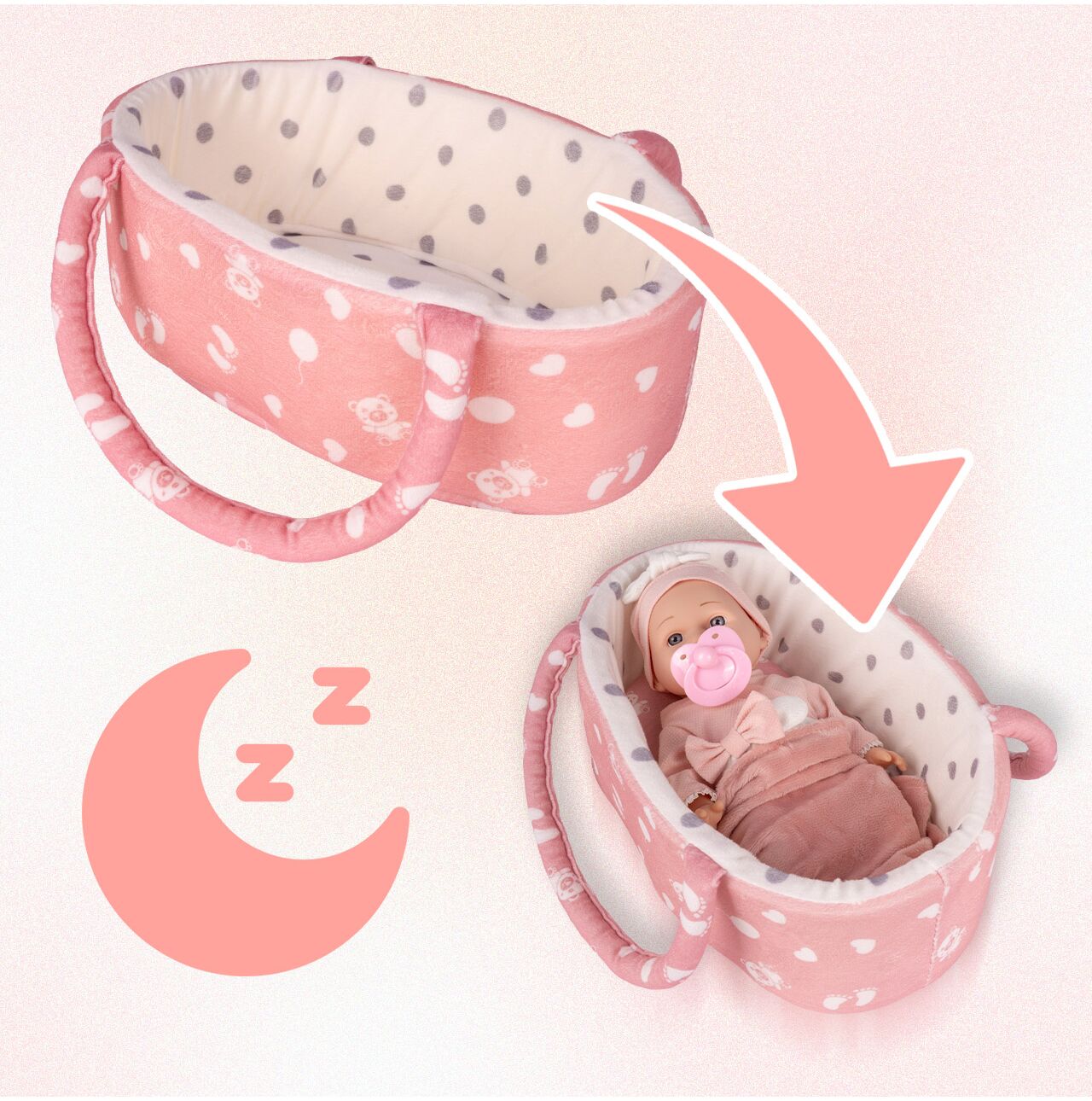 - Urocze nosidełko/kołyska z rączkami – łatwe przenoszenie i „usypianie” lalki w każdym miejscu.
