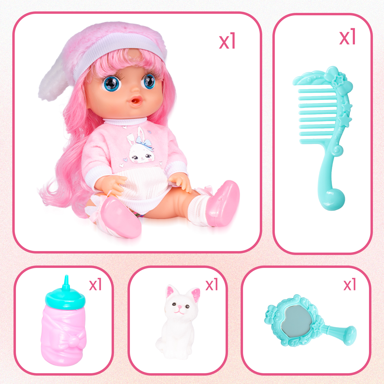 - urocza lalka bobas 30 cm (ok. 40 cm z czapką-uszkami) – pastelowy, mięciutki strój, duże błękitne oczka
