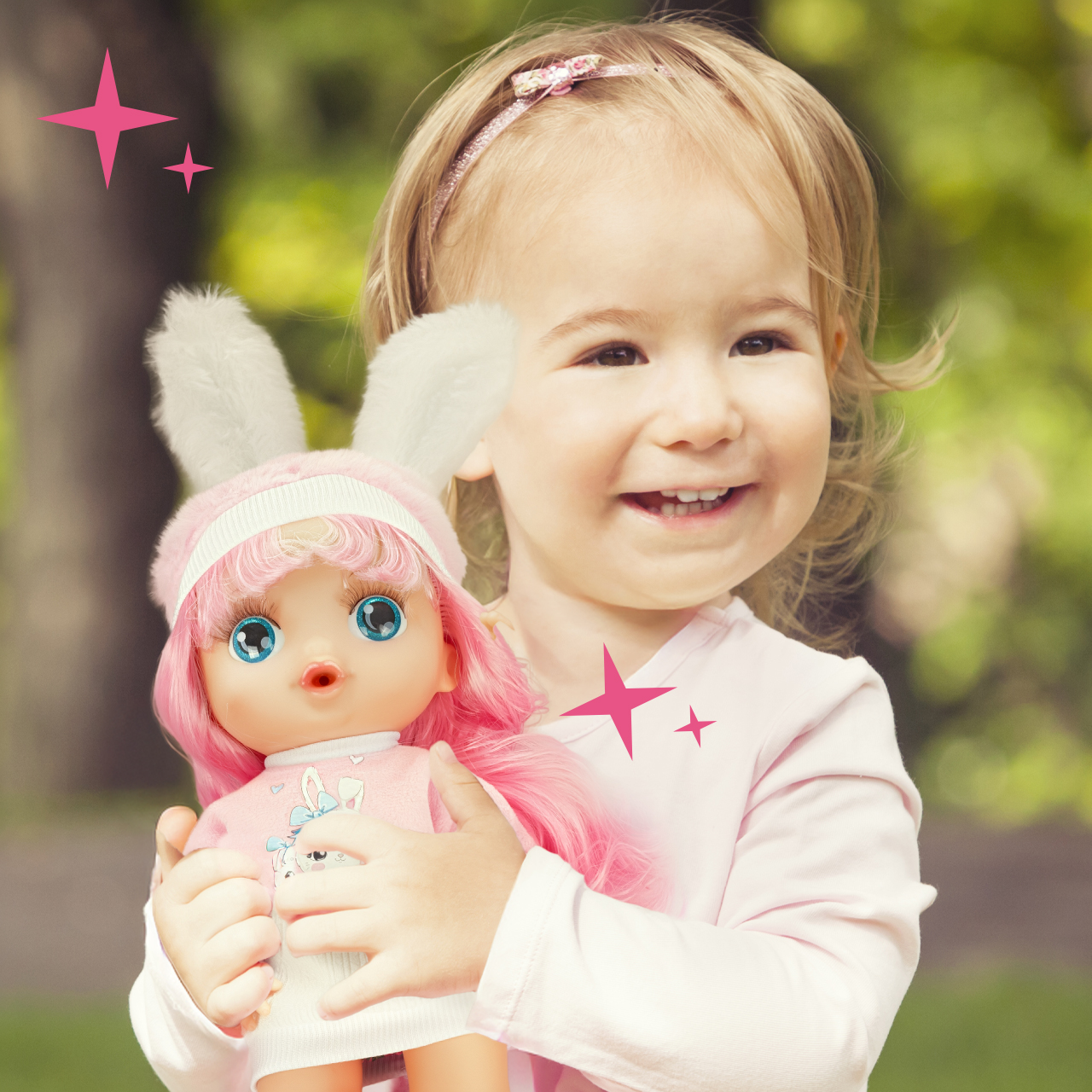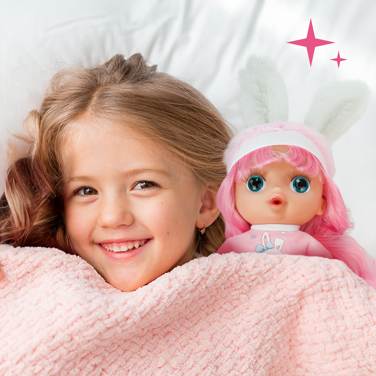 Lalka ma śliczną sukienkę-sweterek z króliczkiem, puchatą czapkę z uszkami i różowe buciki. Ubranka są zdejmowane – idealne do przebieranek i zdjęciowych stylizacji.