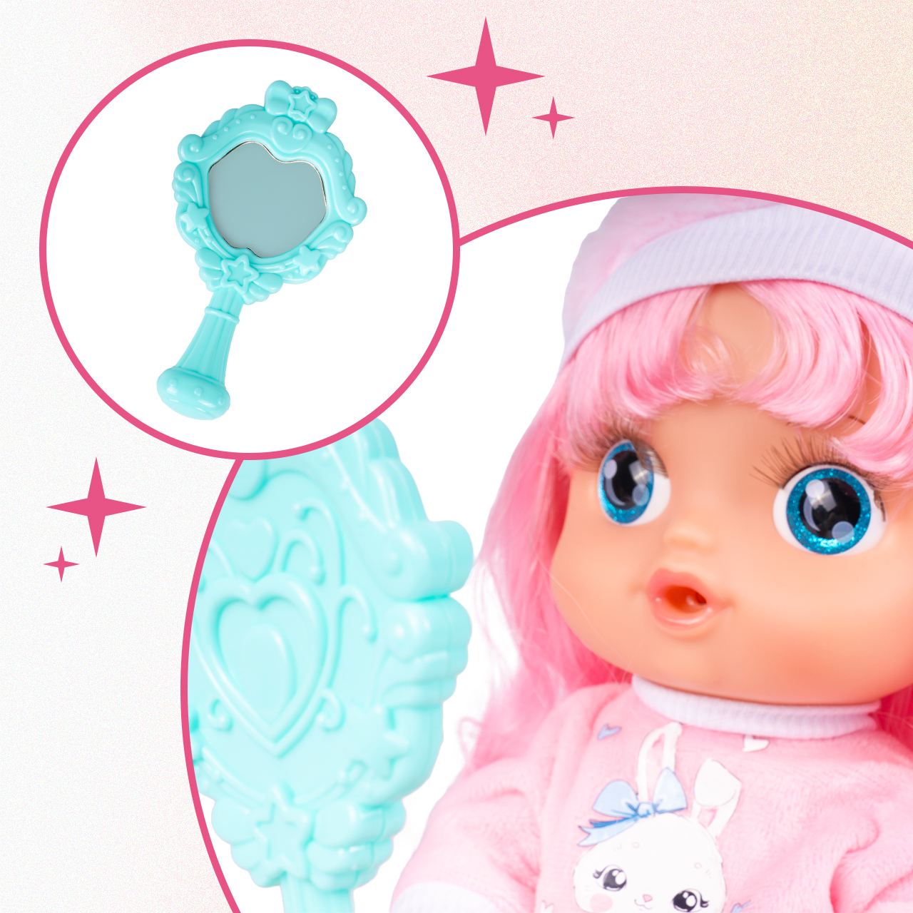 Długie, różowe włosy aż proszą się o stylizacje. W komplecie znajdziesz grzebyk i lusterko – mała stylistka stworzy loki, przedziałki i upięcia.