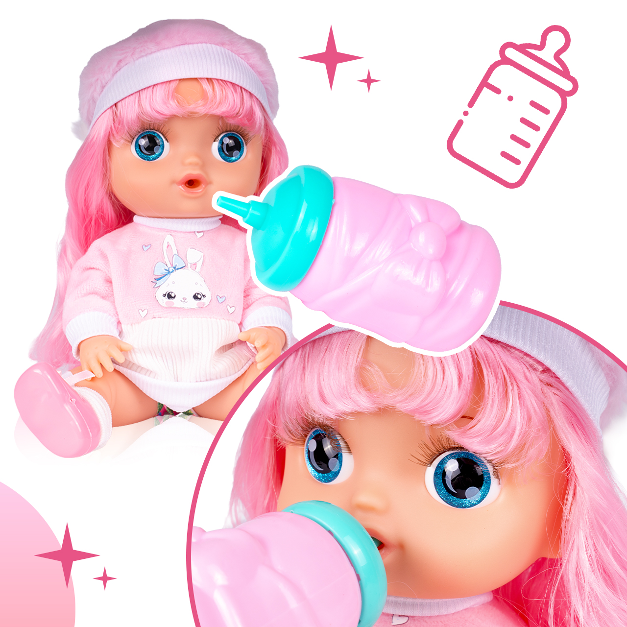 Napełnij dołączoną butelkę (np. wodą – tylko do zabawy) i odegraj scenkę karmienia. To bezpieczna, prosta czynność, która pomaga naśladować opiekę nad dzidziusiem bez funkcji siusiu.
