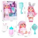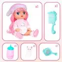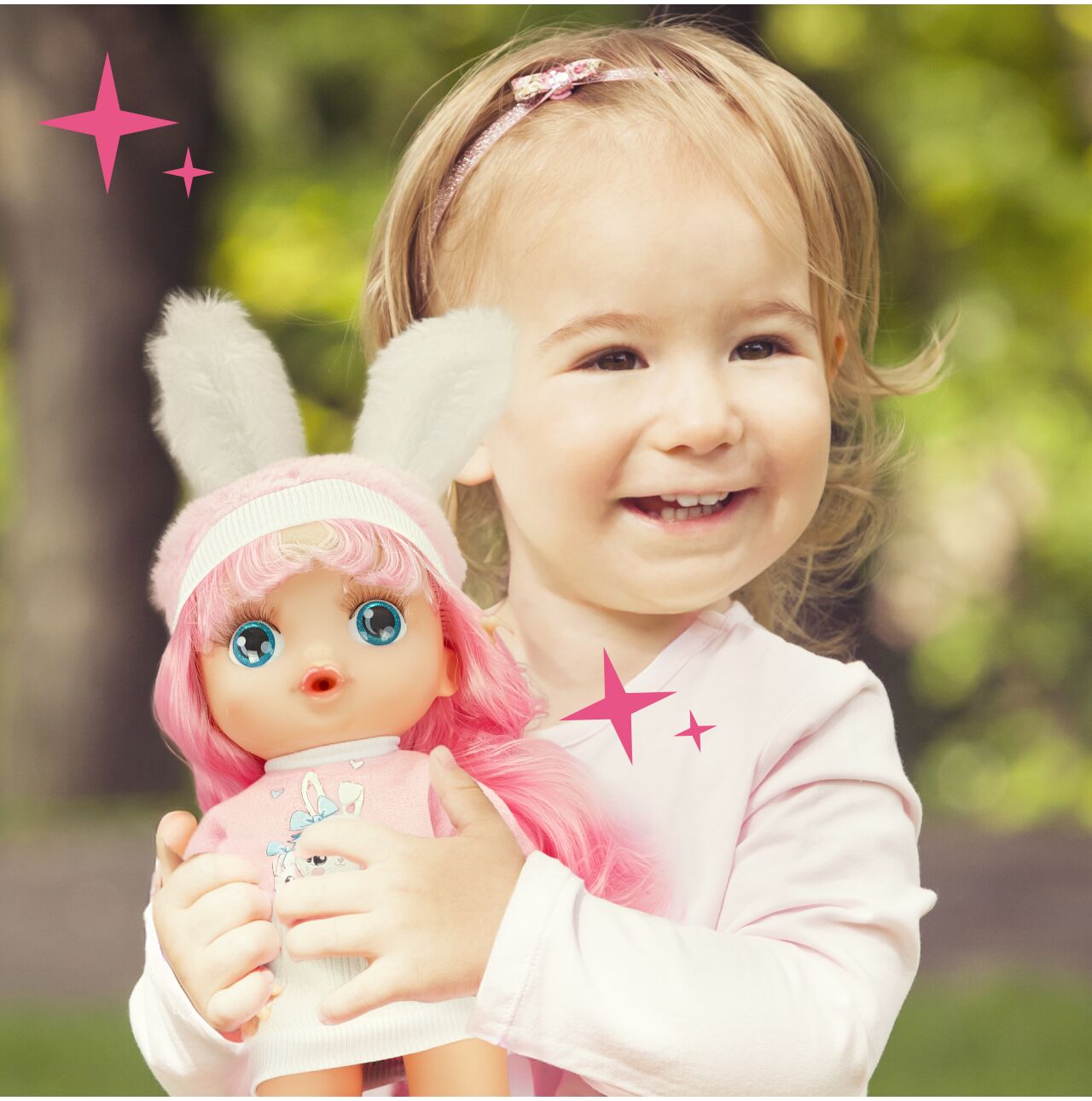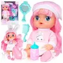 - urocza lalka bobas 30 cm (ok. 40 cm z czapką-uszkami) – pastelowy, mięciutki strój, duże błękitne oczka
