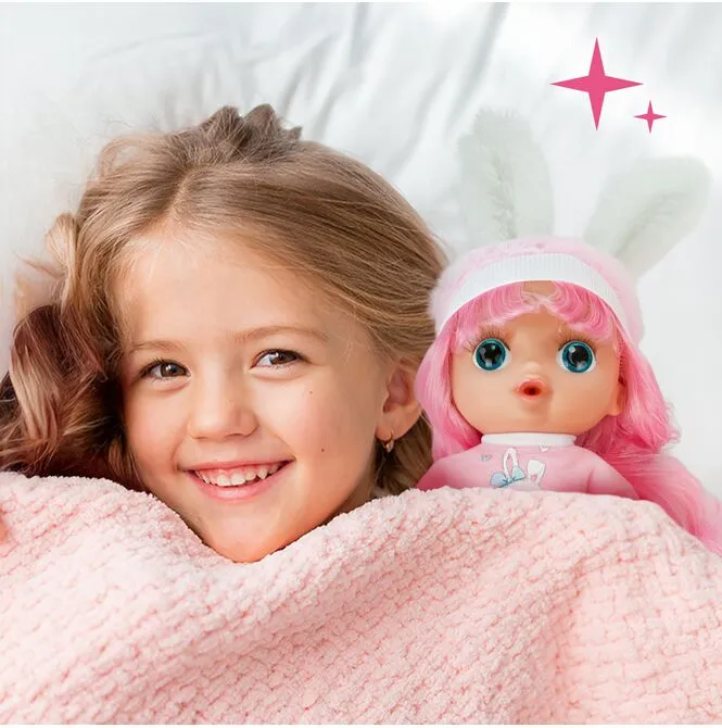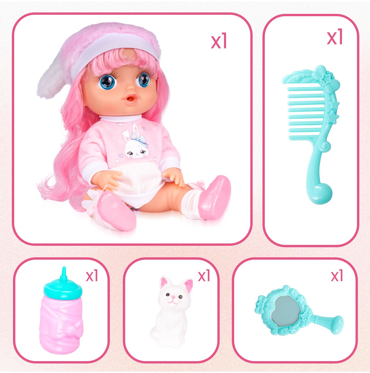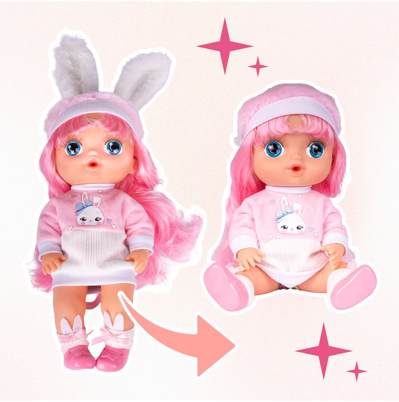 Lalka ma śliczną sukienkę-sweterek z króliczkiem, puchatą czapkę z uszkami i różowe buciki. Ubranka są zdejmowane – idealne do przebieranek i zdjęciowych stylizacji.